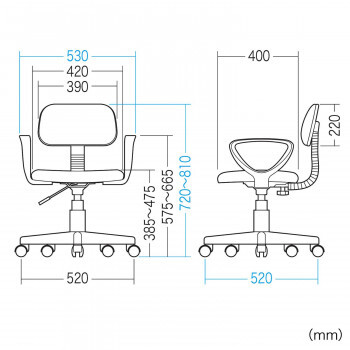 サイズ | 本体:W530×D520×H720~810mm、背もたれ:W390×H220mm、座面(座面調節):W420×D400×H385~475mm 個装サイズ:18.5×53.0×58.2cm |