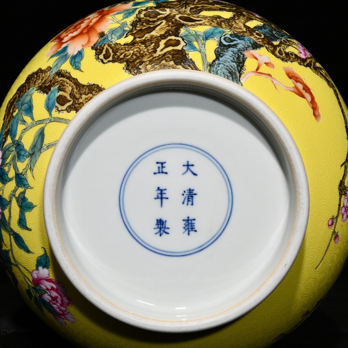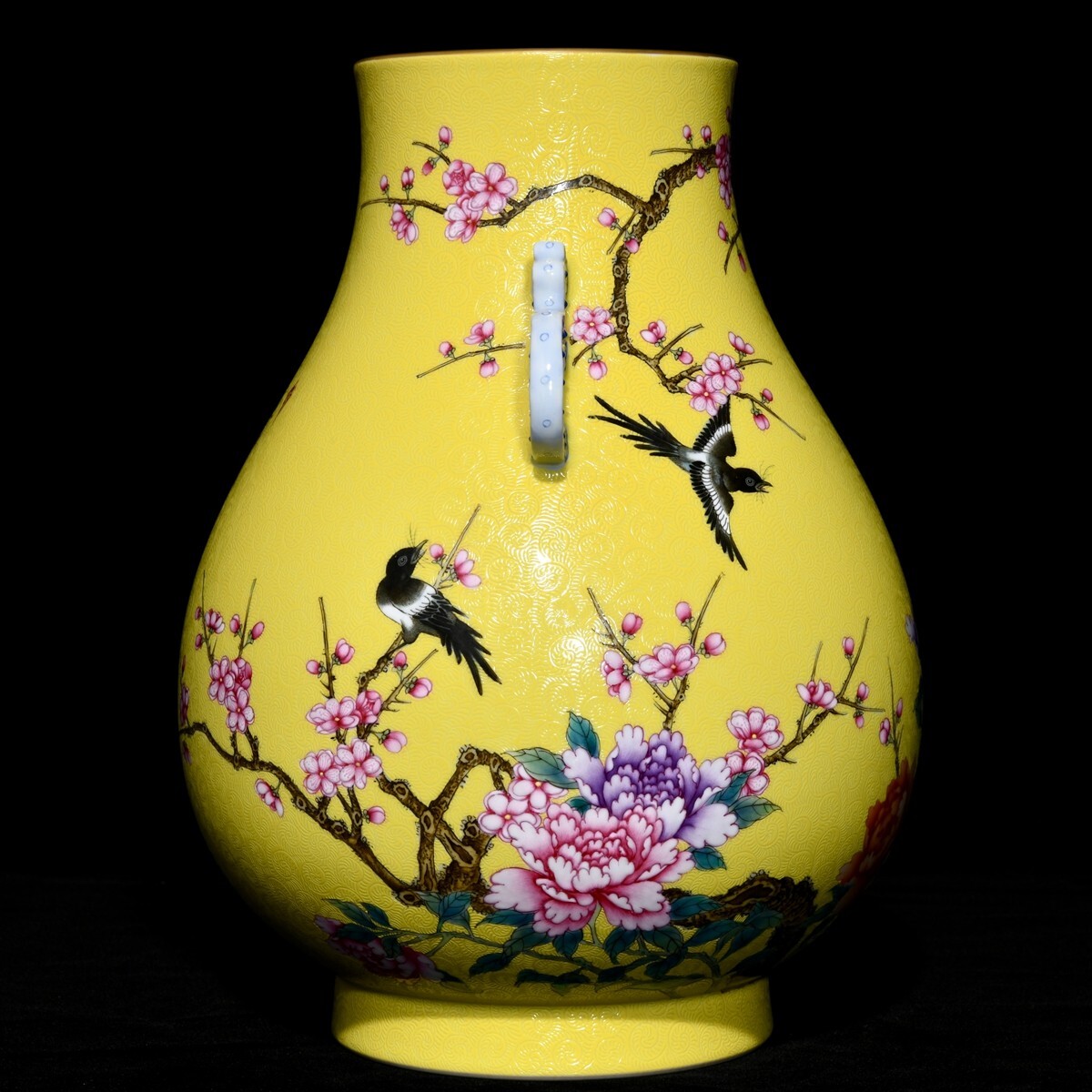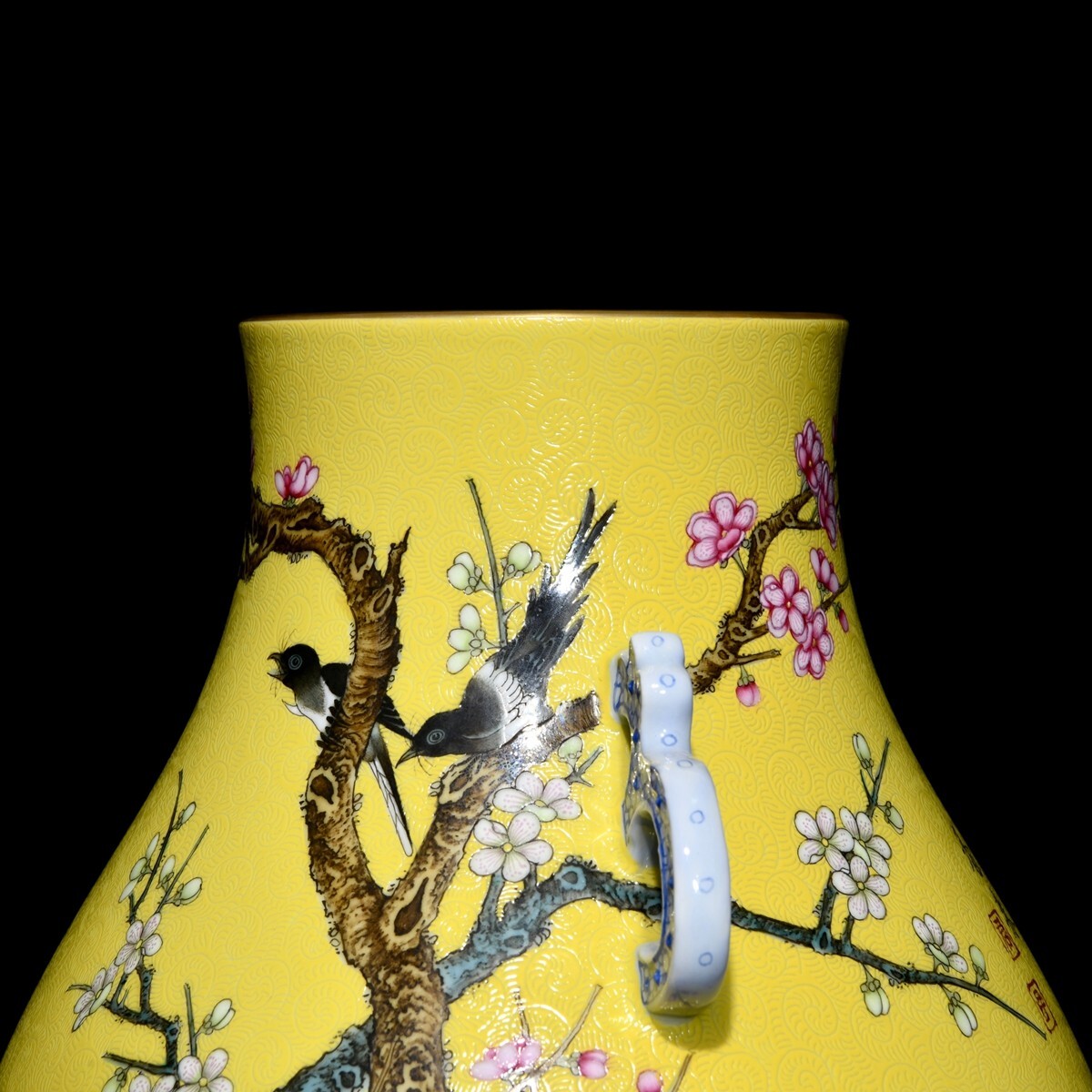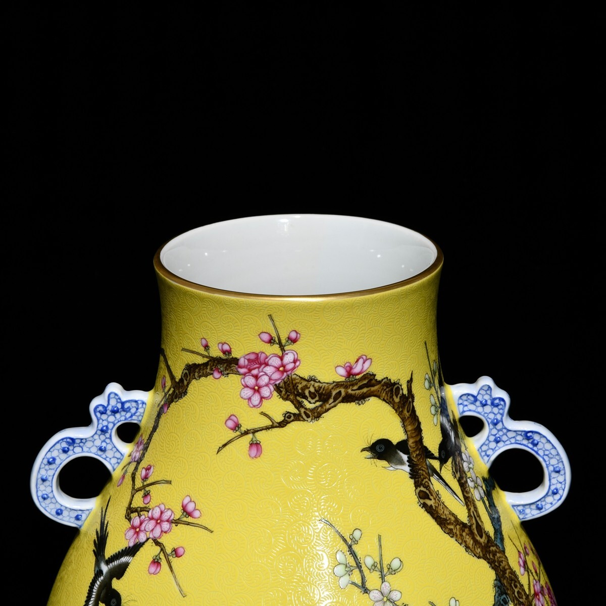 「清 雍正年製 陶磁器 黄地軋道粉彩花鳥紋 双耳尊」染付 置物 擺件 古賞物 中国古美術 旧蔵出