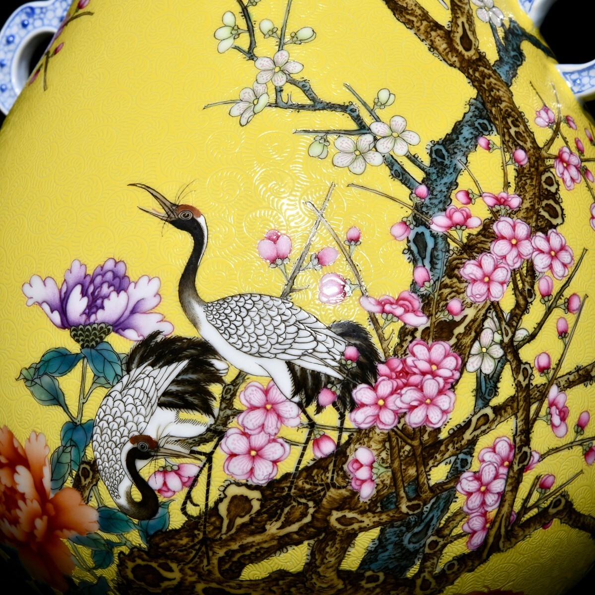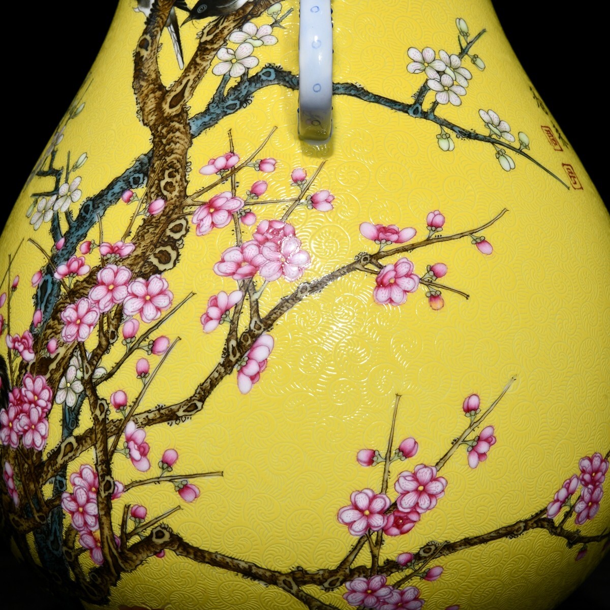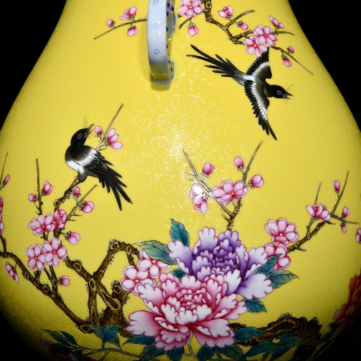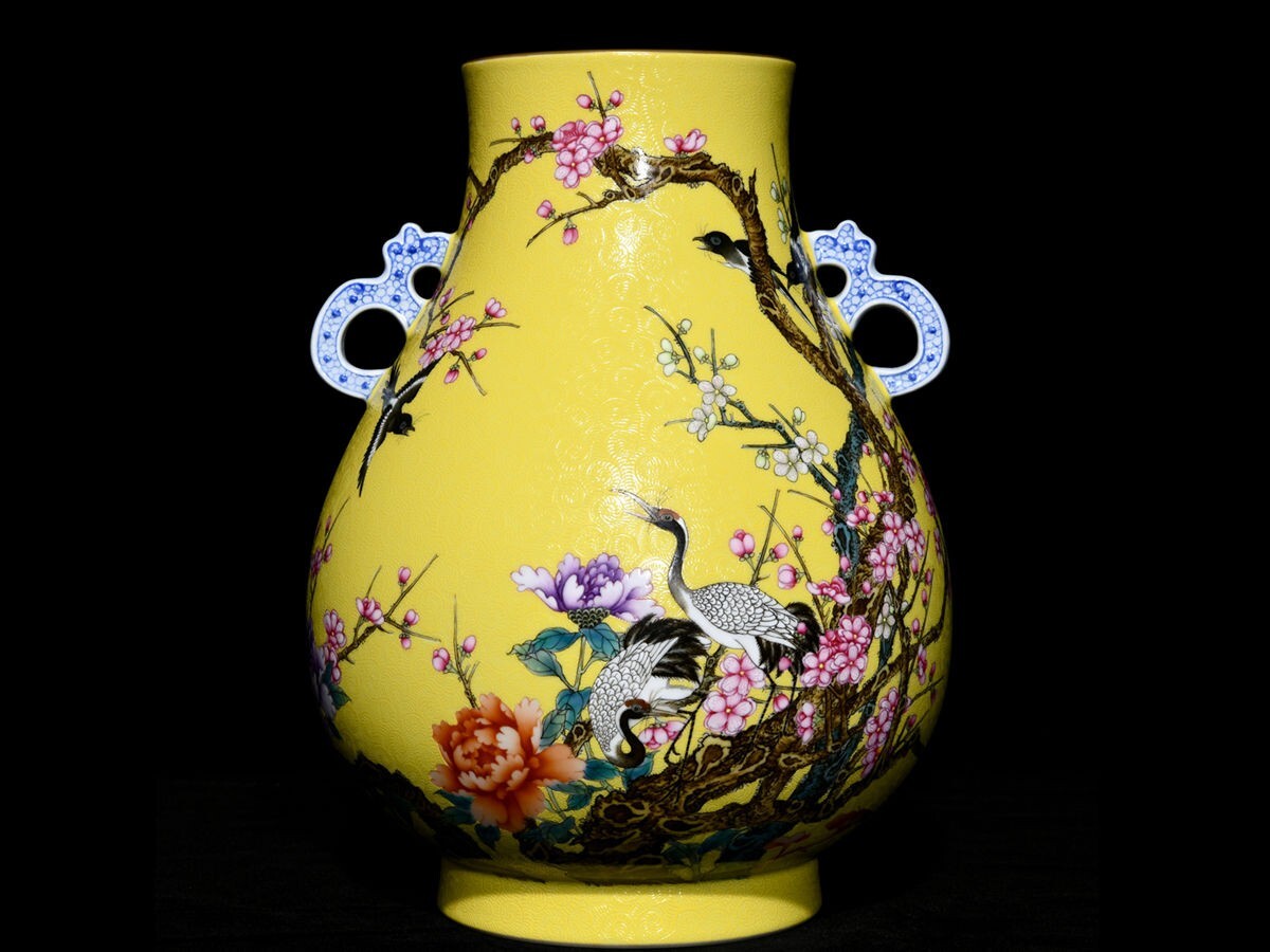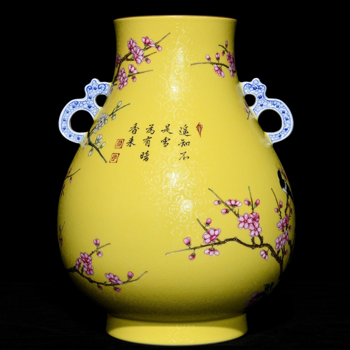 「清 雍正年製 陶磁器 黄地軋道粉彩花鳥紋 双耳尊」染付 置物 擺件 古賞物 中国古美術 旧蔵出