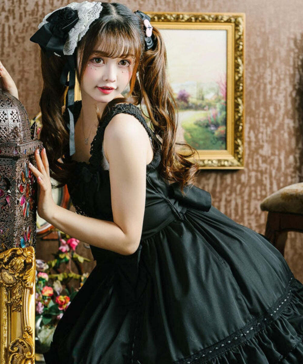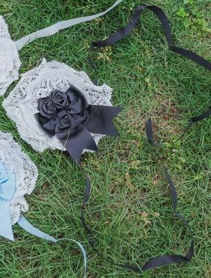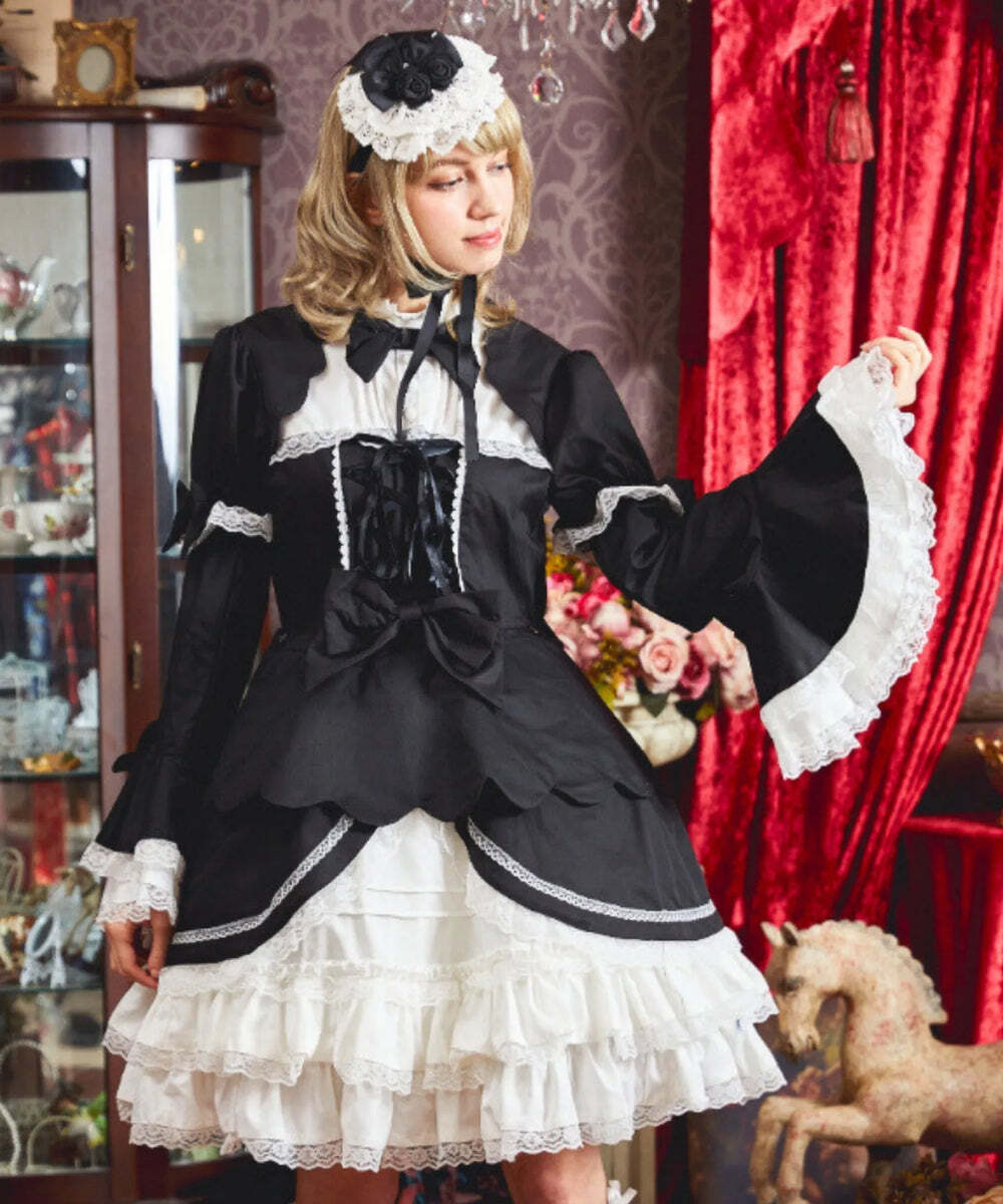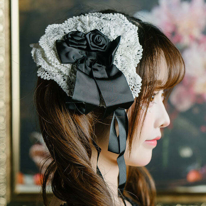 2段のトーションレースと2つの巻き薔薇と大きめ飾りリボンがクラシカルなかわいさの丸型ヘッドドレスです。