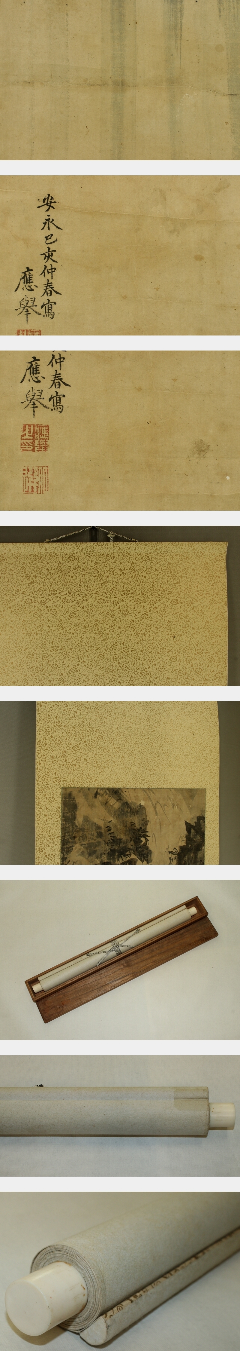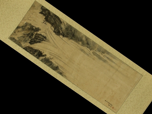 円山応挙 まるやま-おうきょ(1733-1795) 江戸後期の画家。円山派の祖。丹波生。 字は僊斎・仲選、号は一嘯・夏雲・仙嶺等、通称は主水。 石田幽汀に狩野派の画法を学び、幽汀の写生的画法に、宋・元画の技法を取り入れると共に、 西洋画の遠近法を研究して一家を成した。動植物の写生を最も能くする。 寛政7年(1795)歿、63才。 本紙は、染み、汚れ、強い折れ、皺、虫食い、破れ、生地剥れ、ヤケがあります。 表装は、染み、汚れ、折れ、皺、軸先に汚れ、箱に割れがあります。 【サイズ】 作品 横約43.5cm×縦約127cm 表装 横約55cm×縦約183cm |