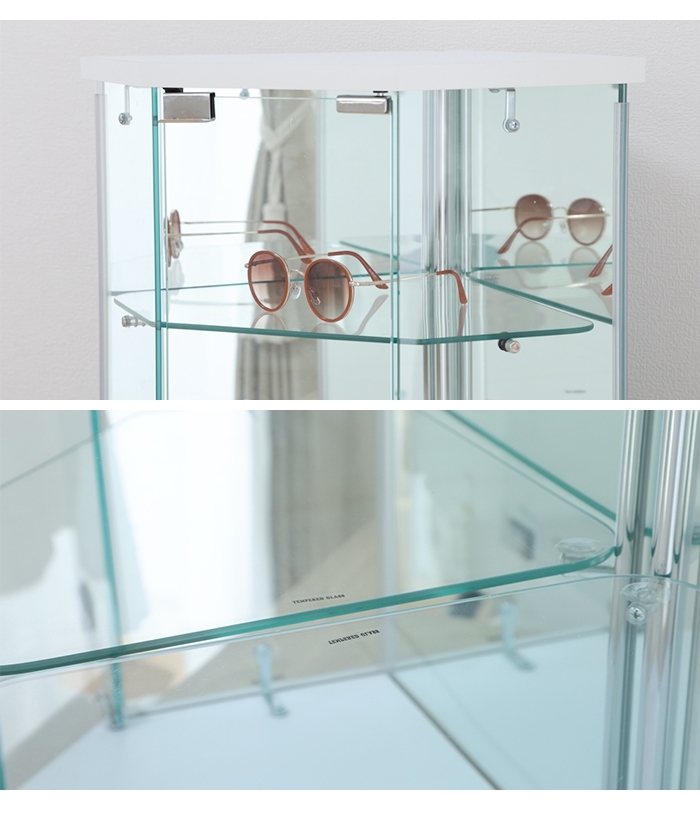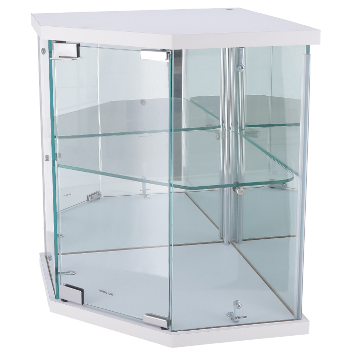 | スペースを活用したコーナー型卓上ガラスコレクションケース。 |