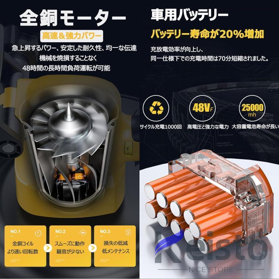 大容量バッテリーがオプションで、本体に装着可能。 ワイヤレスリチウムバッテリーは長持ちし、バッテリー寿命は従来のバッテリーより30%長くなります。 作りが便利で、長く使えます。 効率的な放熱、回転放熱技術、多孔質放熱により、モーターを焼損から保護します。低温環境下でも使用可能です。