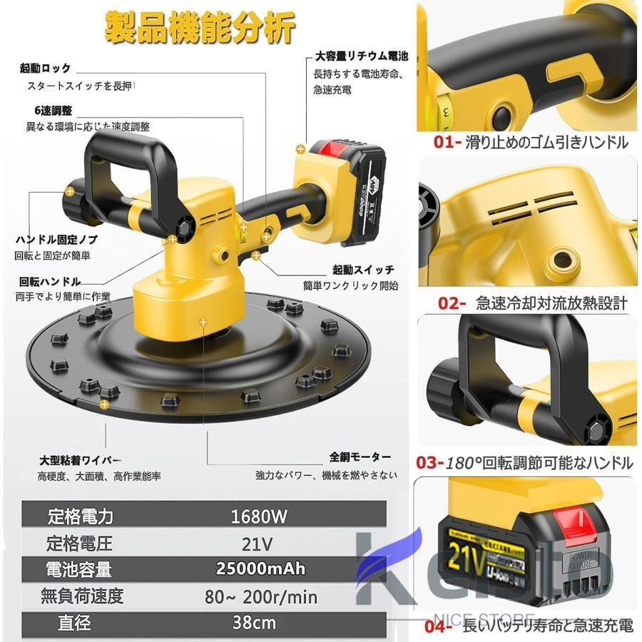 充電式トロウェルモルタルやセメントの凹凸を簡単に取り除き、広い面積でコンクリートの床を平らにすることができます。作業効率をスピードアップし、時間と労力を節約し、作業結果の品質を向上させます。この製品は、他の研磨機のさまざまな直径 38cm【作業効率の向上】
