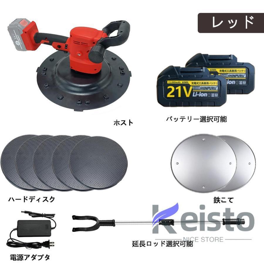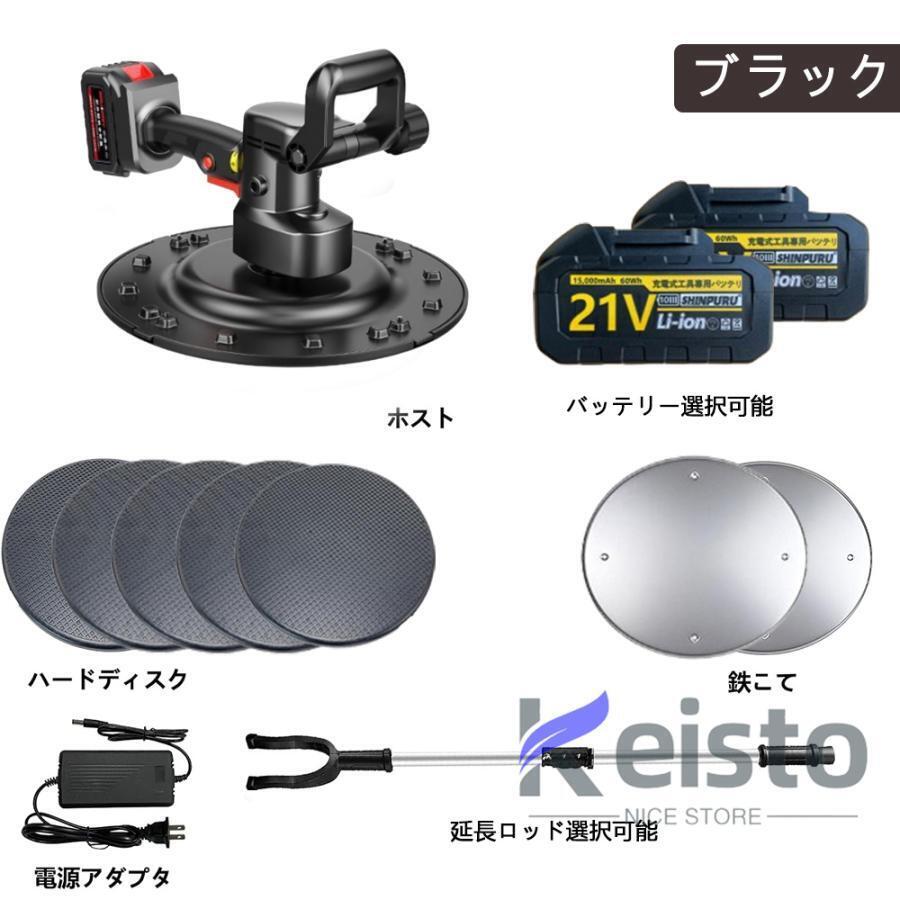 【パッケージリスト】電動トロウェル本体、 延長ロッド 、21Vバッテリー2個-充電器1個、樹脂回転盤4枚、鉄製回転盤2枚