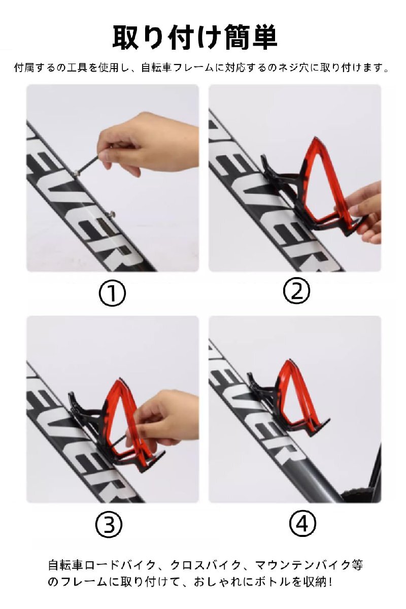 【取り付けが簡単】ダウンチューブ、シートチューブ等、自転車フレームに設置された一般的なボトルケージの台座に、ボルトで簡単に取り付け可能です、傷を付けません。※必要な取り付け金具を含め(単個ボトルケージがネジは2本付属して、取付器具が1枚付属しています)。