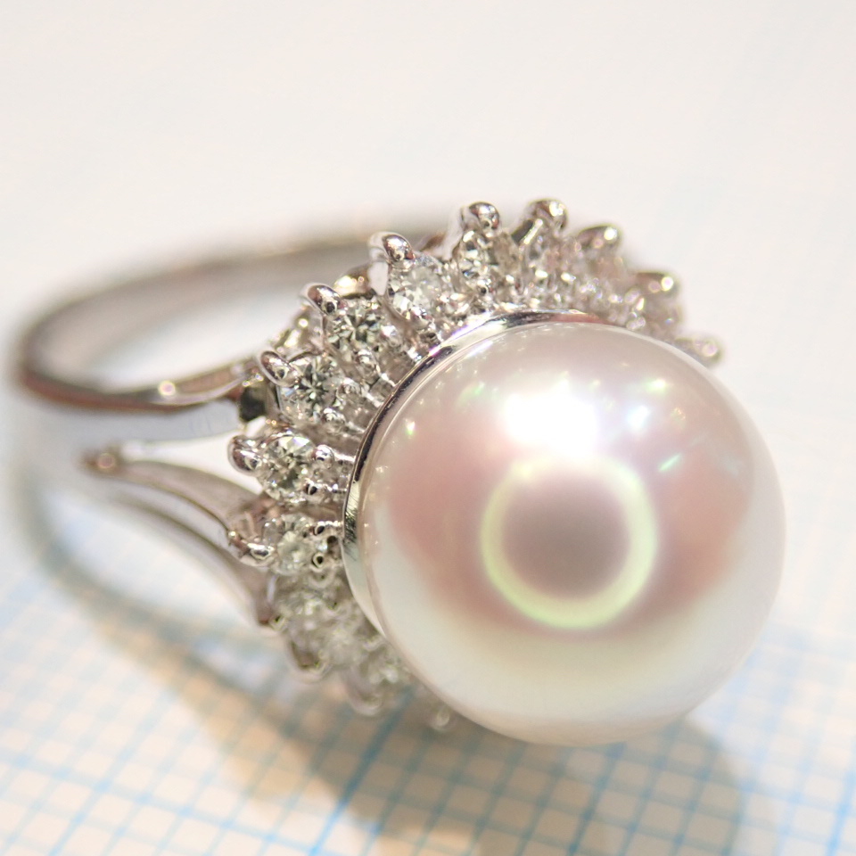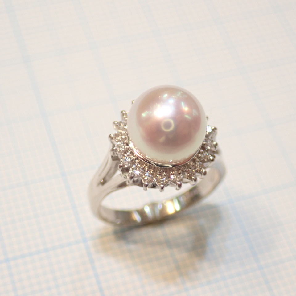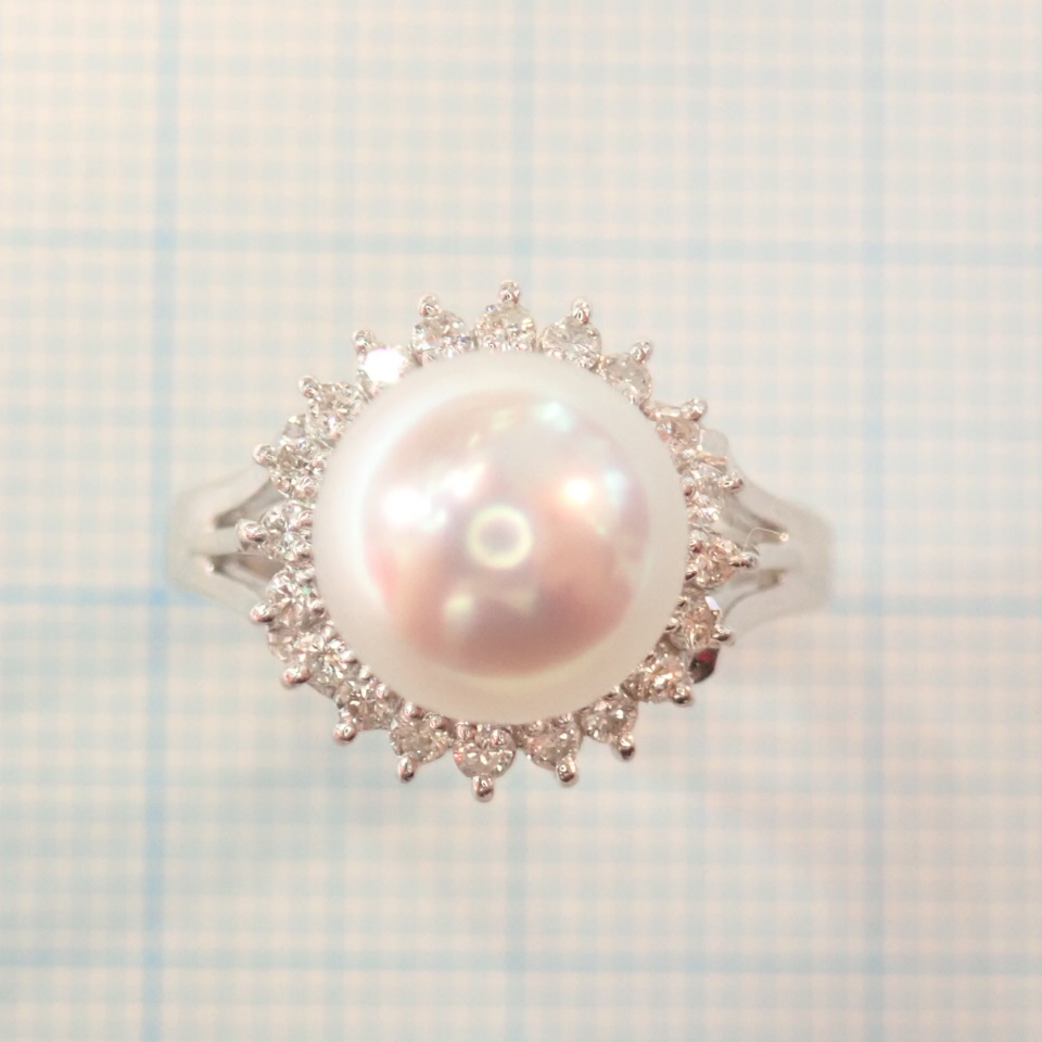 ホワイトピンク系のあこや真珠(照りもあり)を使用し、取巻きのダイヤモンドが照りがありキラキラ綺麗な(10倍ルーペ越しではインクルージョンはあります)豪華な造りです。
