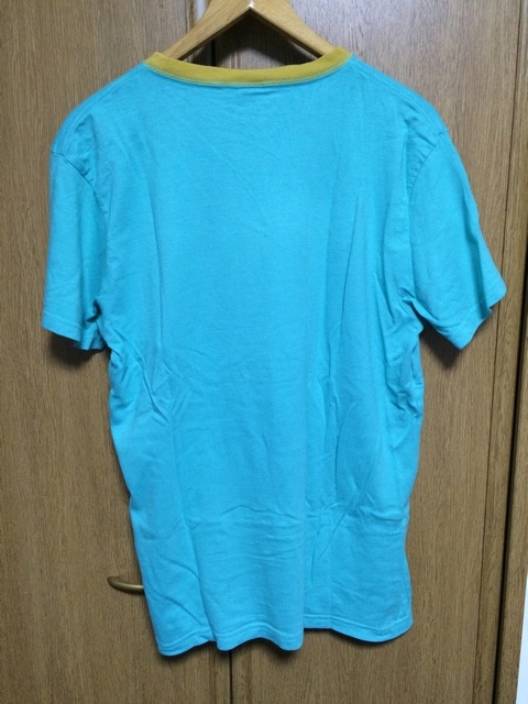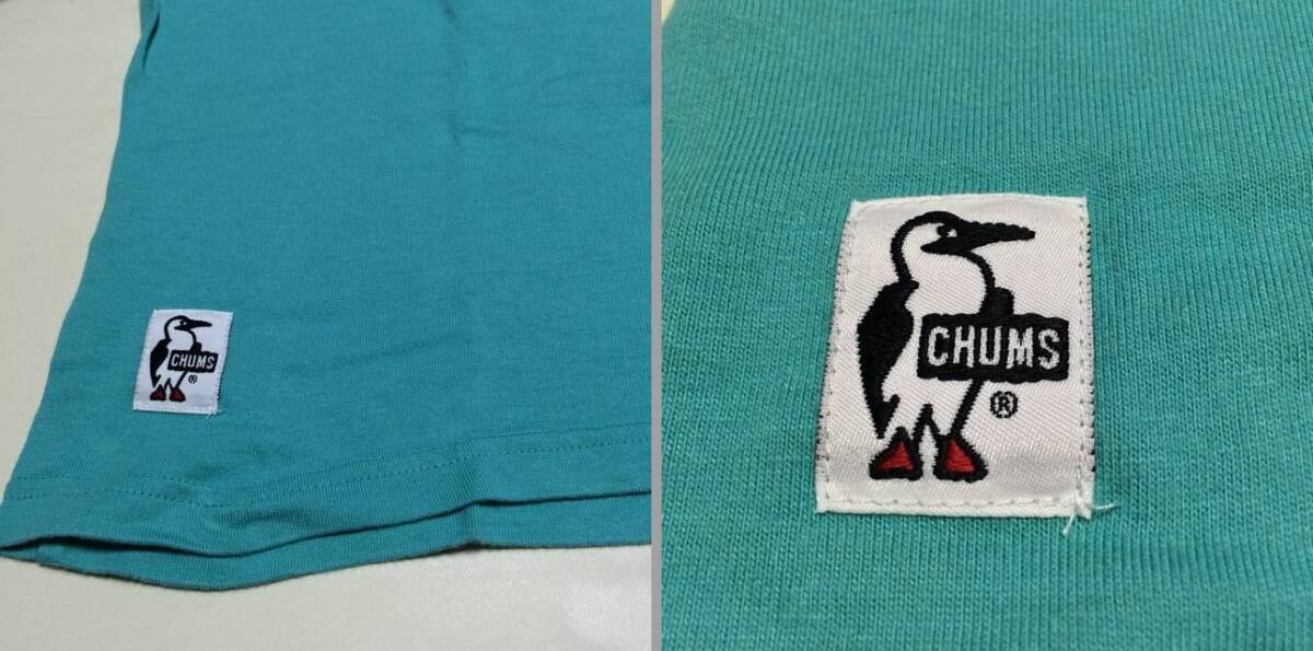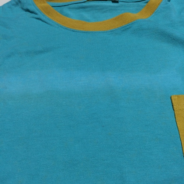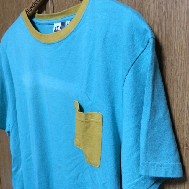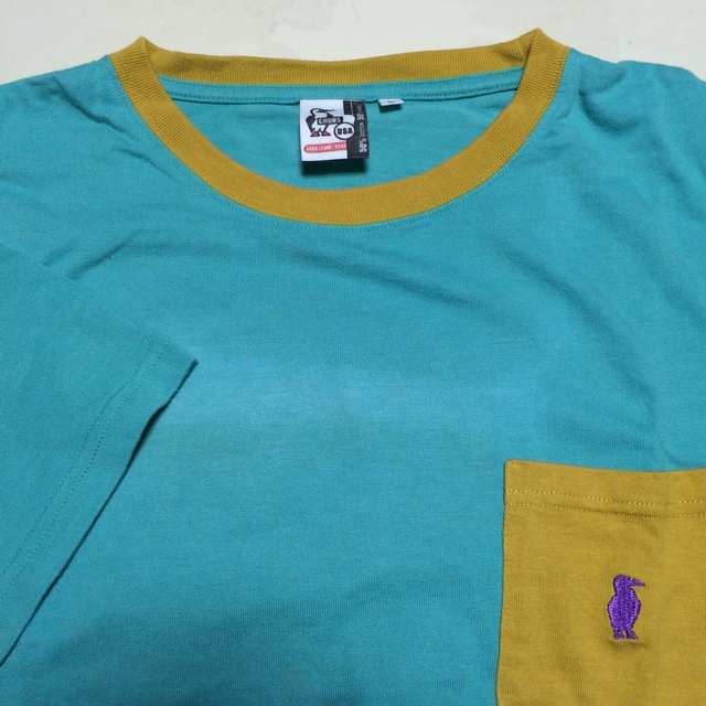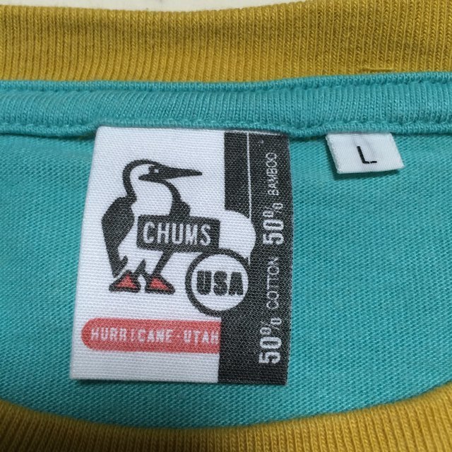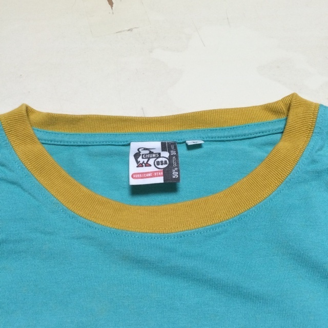 商品説明・状態 | 1.Chums の半袖Tシャツで、ターコイズブルー色無地 薄茶のリンガーTシャツです。 2. 左胸にロゴししゅう付きポケットがあります。 3. 綿+竹の混紡で、 とてもさわやかな生地感です。3 4.胸の部分にスレによる薄い白化が見られますが、写真よりは目立たないと思います。 5.着用回数は少なく、スレ、ほつれ、目立つ退色はありません。サイズの合う方いかがですか。 | |