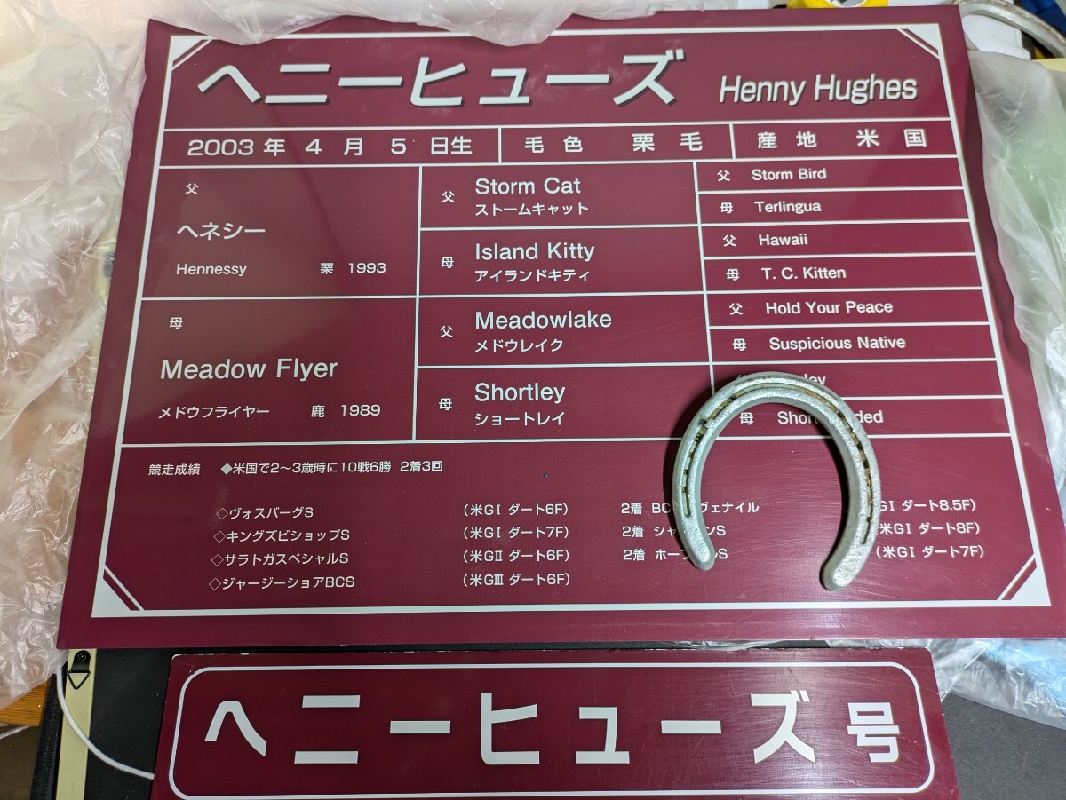 本商品は、種牡馬ヘニーヒューズ(Henny Hughes)の実際に使用されていた馬房掲示用の血統表パネルと実使用の蹄鉄のセットです。