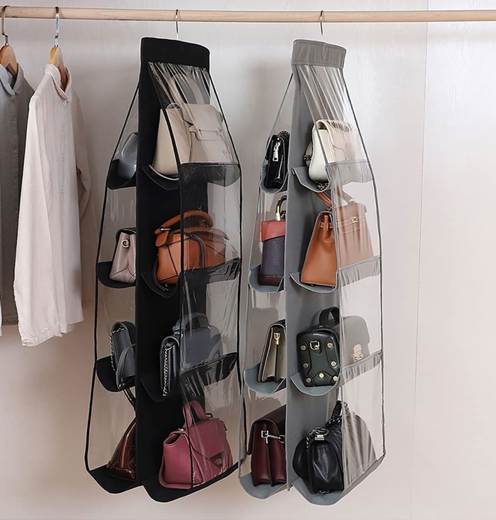 【両面収納・容量の2倍】吊り下げ収納4段式は8つのコンパートメントがあり。幅16cm、高さ30cm以内のバッグを収納できます,バッグをきれいに収納できます、バッグが変形して湿るのを防ぎます。バッグハンガー使わない時は、折りたたんでコンパクトに収納でき。