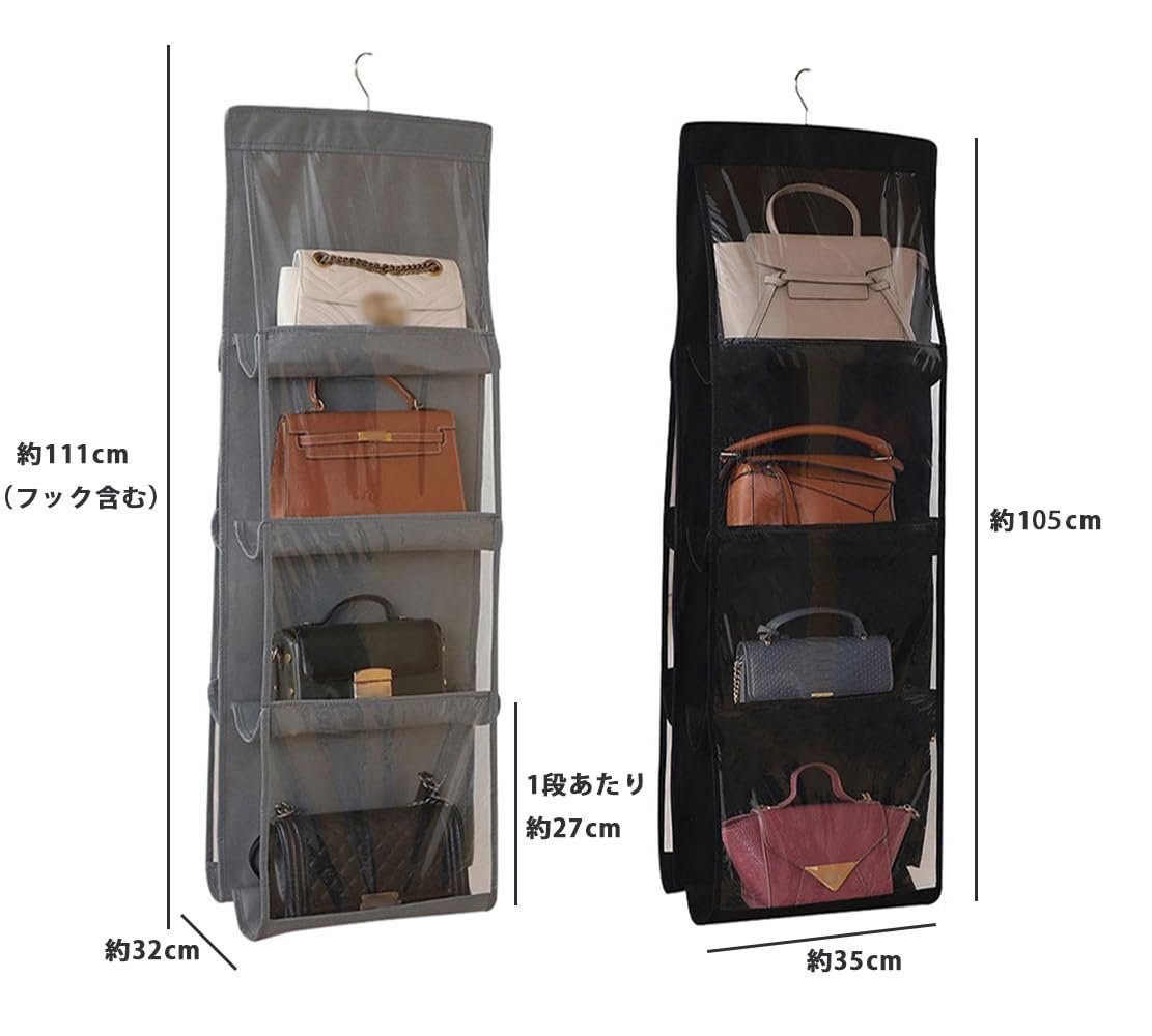 ブランド:Hongmeruカラー:グレーサイズ:8個ポケット【製品仕様】バッグ収納吊り下げ4段展開サイズ:35×32×111cm(フック含む)。220g超軽量、両面収納、8個ポケット、透明PVC+不織布素材、カバン収納耐荷重は全体8kg、1段約2kg。受け取ったときに吊るした収納が少ししわになっているかもしれませんが、時間が経つにつれて平らになりますのでご安心ください。