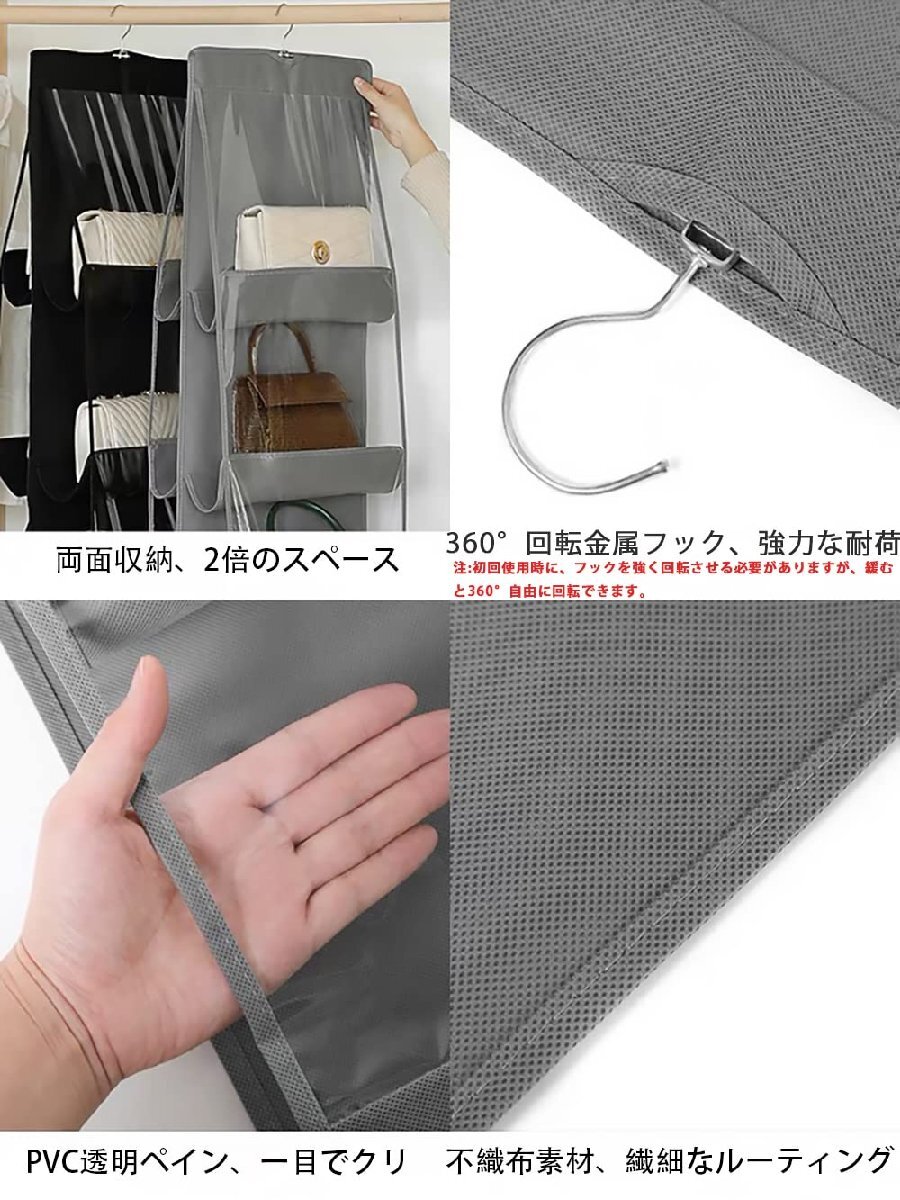 【高品質の素材】高品質のPVC+不織布素材は通気性に優れており、透明なPVC素材が一目で透明で、バッグを選びやすい。吊り下げバッグ収納製品は出荷前に脱臭されています。製品は無毒ですので、ご安心ください、バッグ収納ラック安全で健康的で耐久性があり、美しく実用的で。
