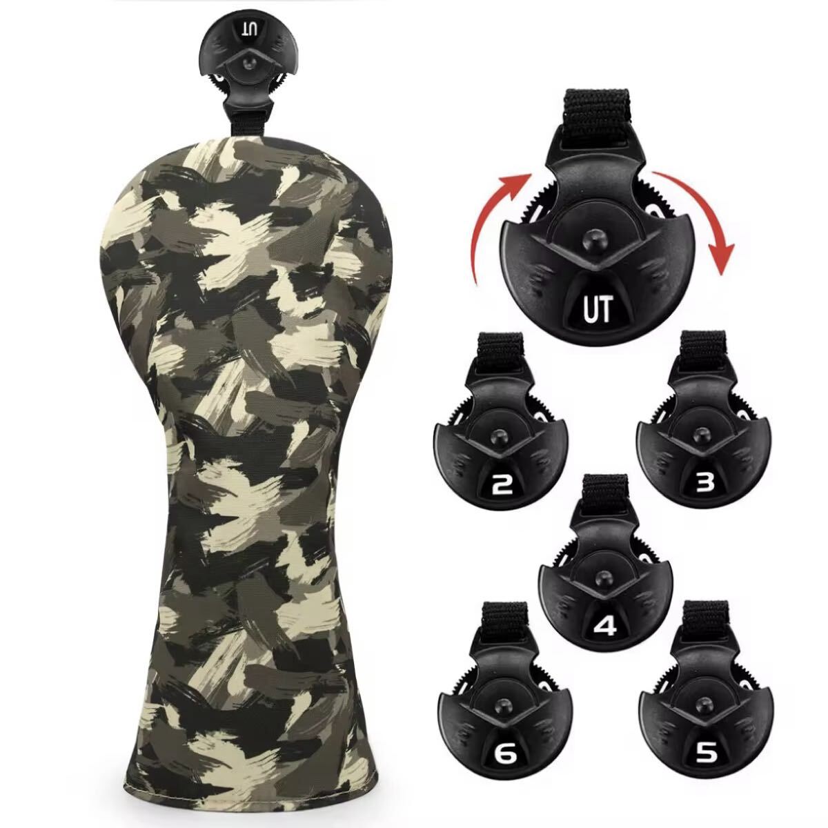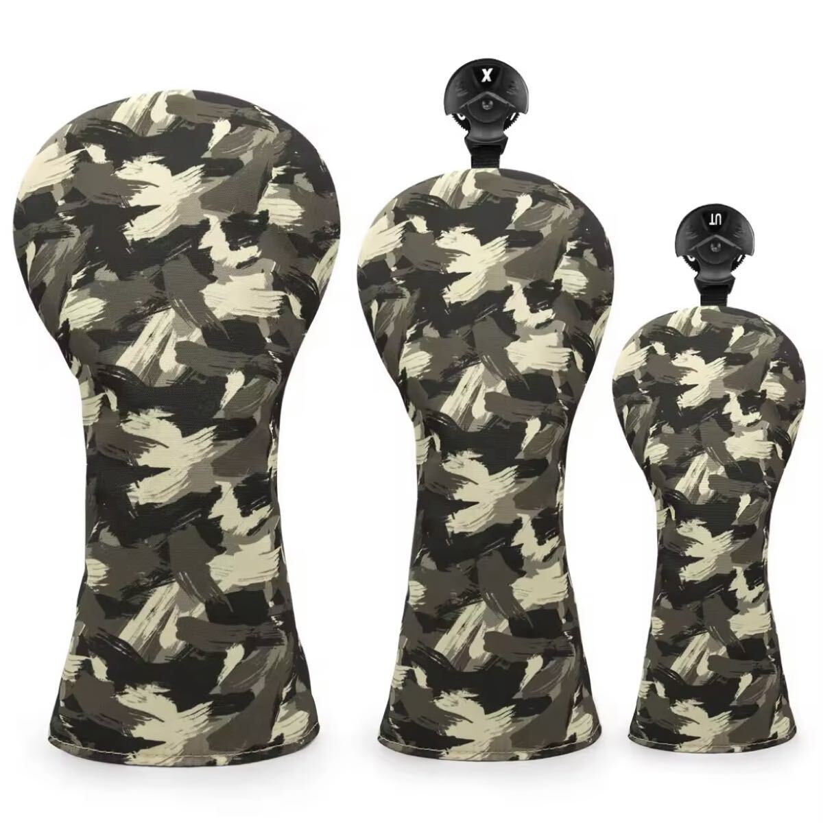 クールなカモフラージュ柄が特徴の、ゴルフ用ヘッドカバー3点セットです。