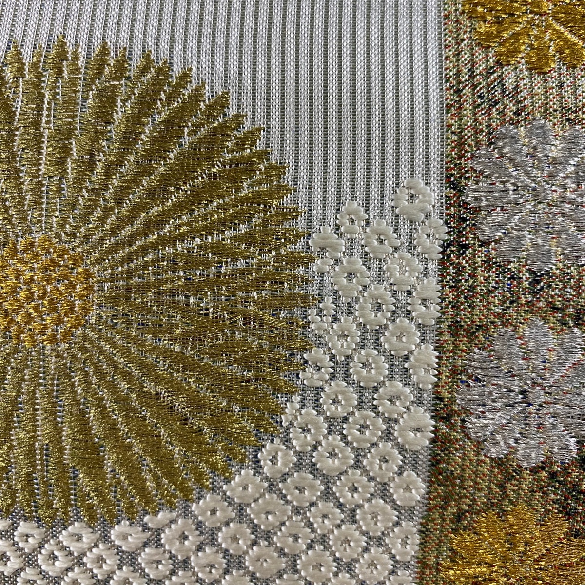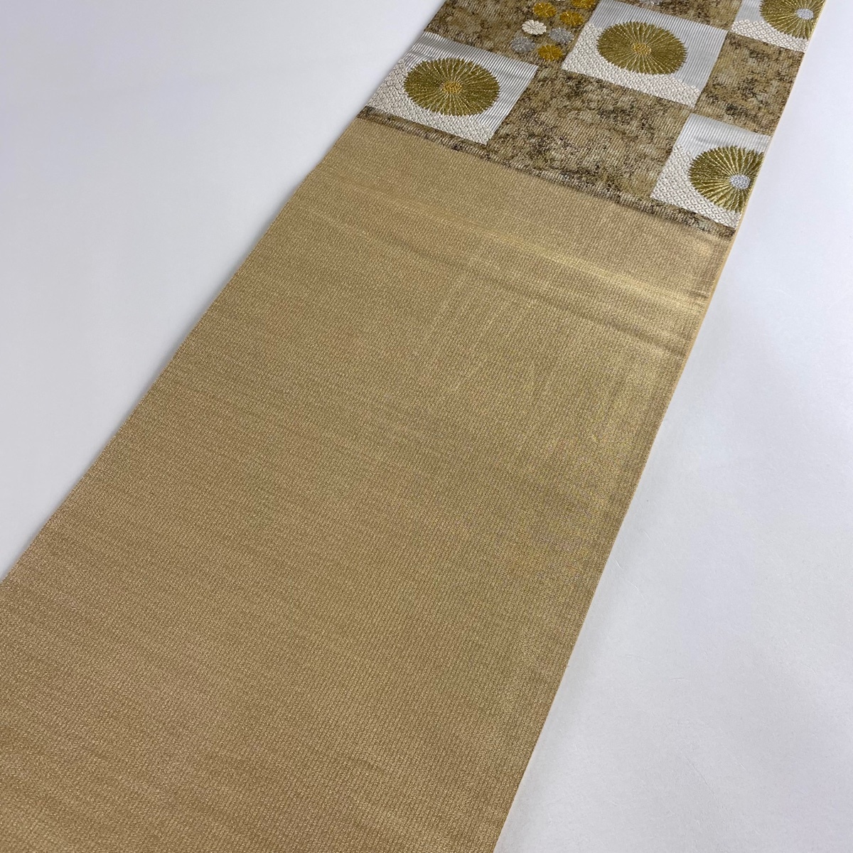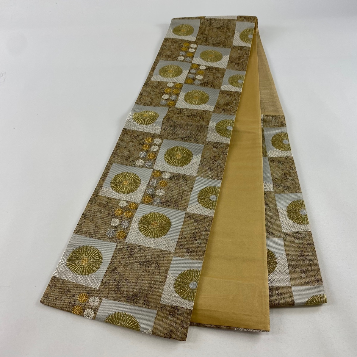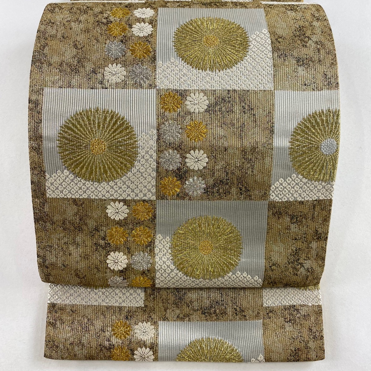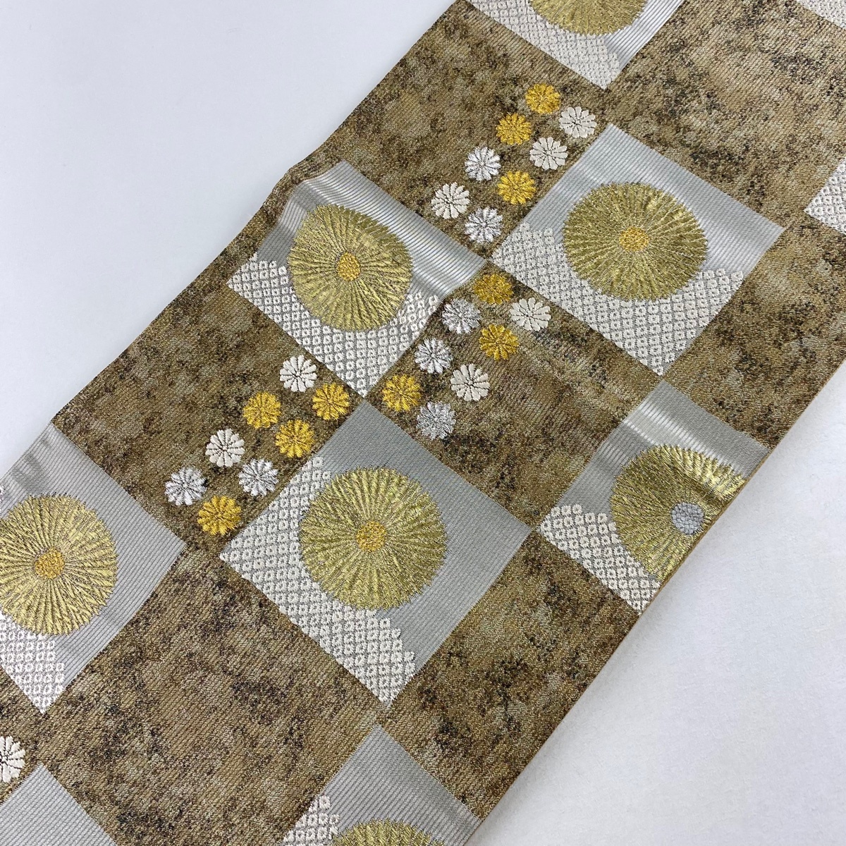 | 袋帯 美品 秀品 市松 菊 金銀糸 箔 金茶 六通 正絹 【中古】 |