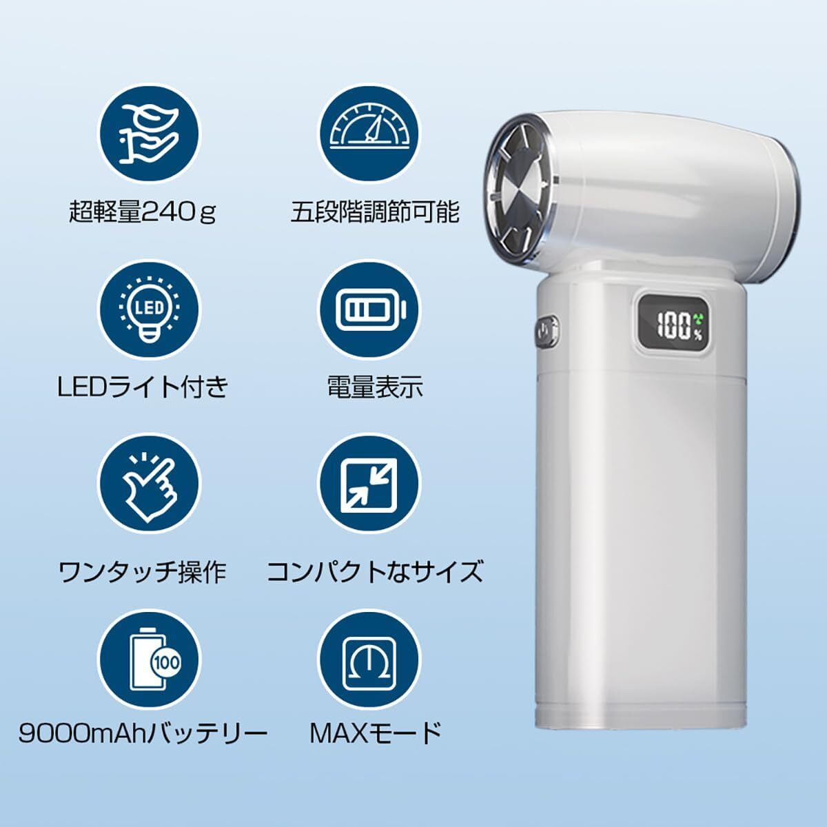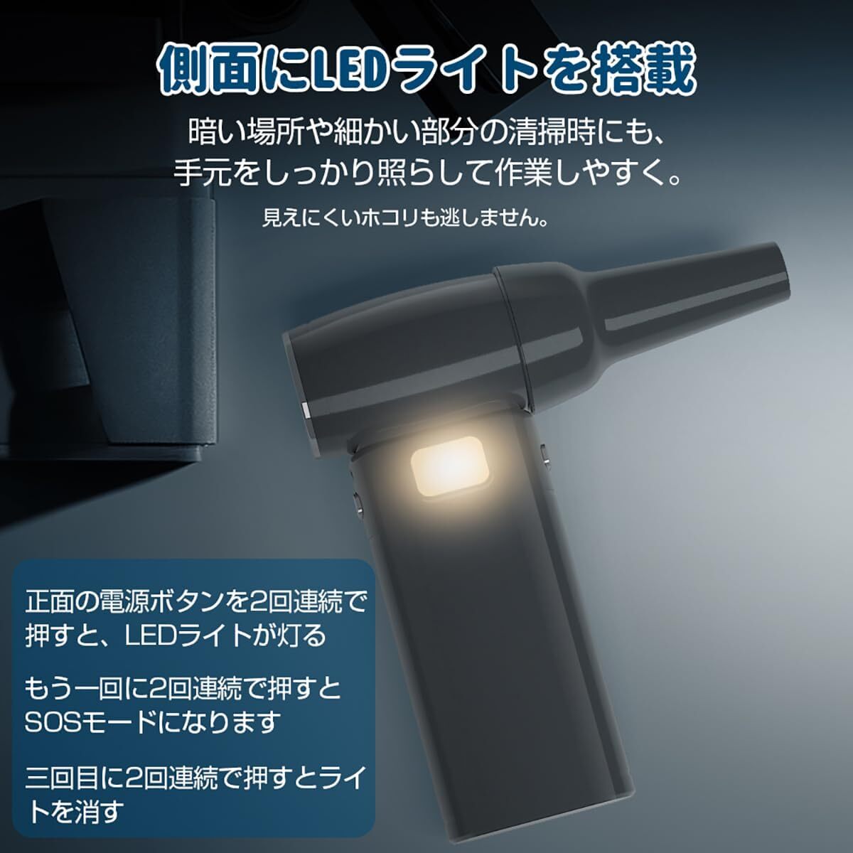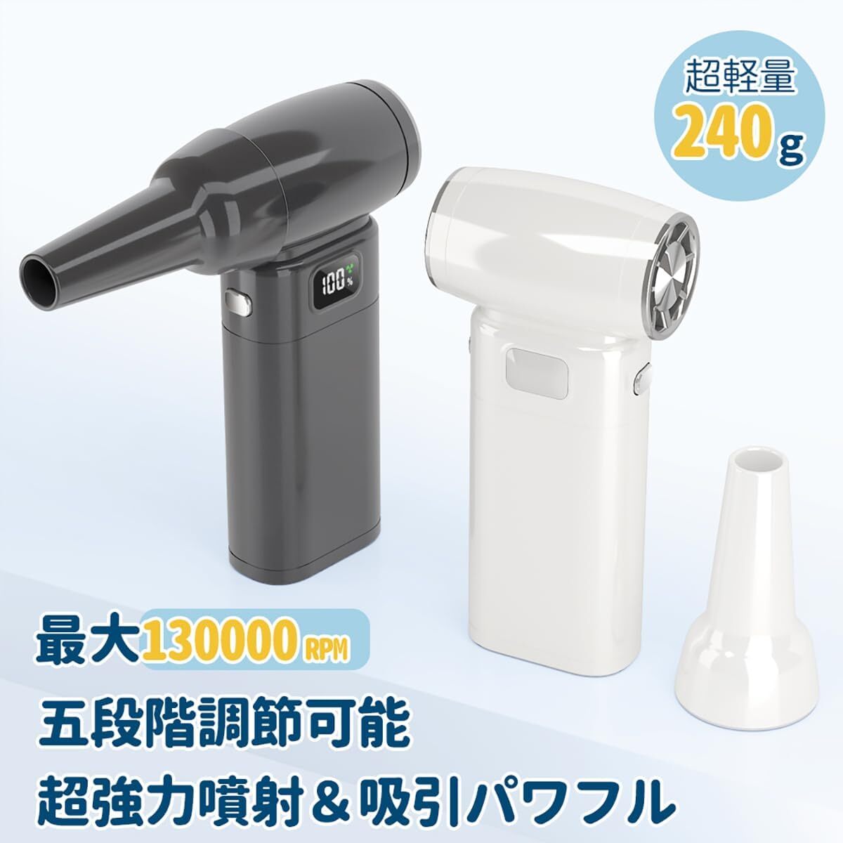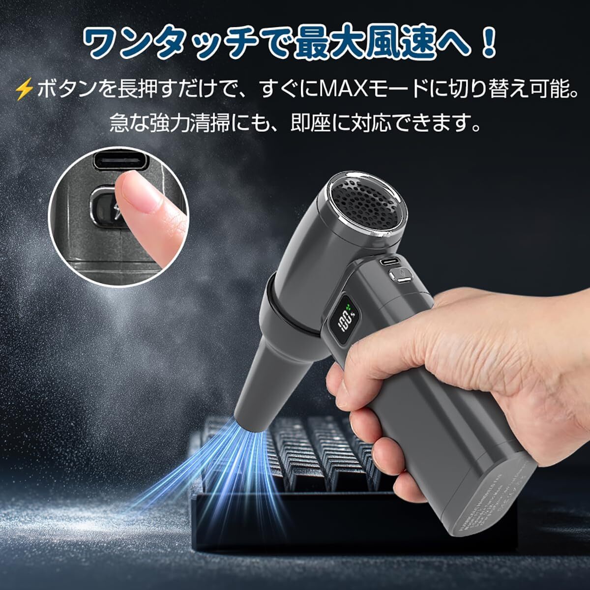 高性能ブラシレスモーターを搭載し、最大回転数は130000RPM。 5段階風量調整に加え、ワンタッチで最強風力が出せるMAXモードも搭載。 キーボードや精密機器の隙間に詰まったホコリも一気に吹き飛ばします。