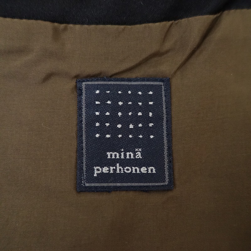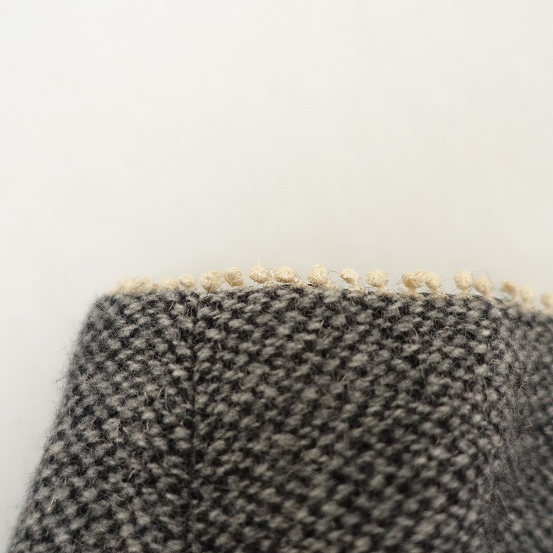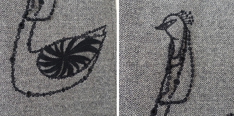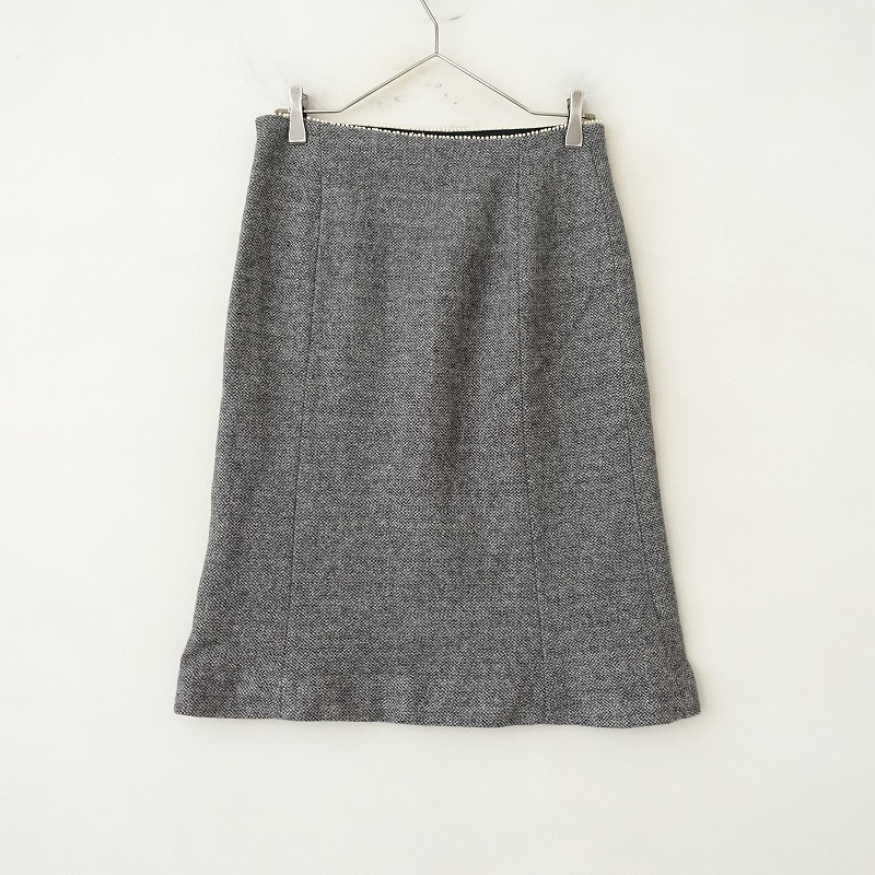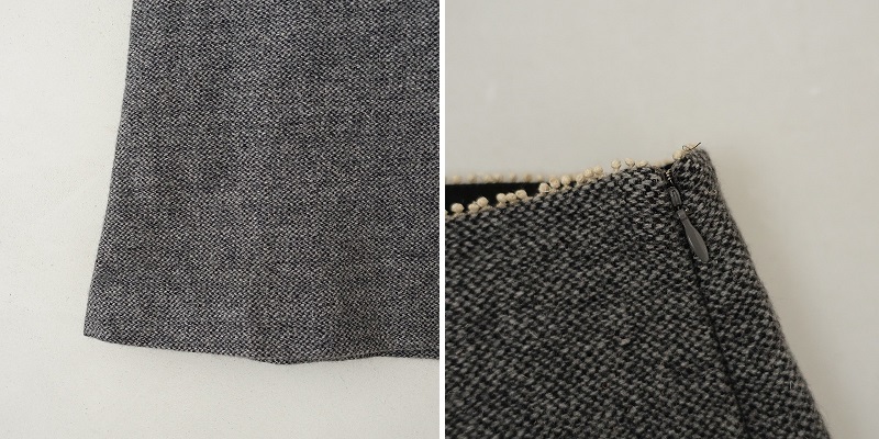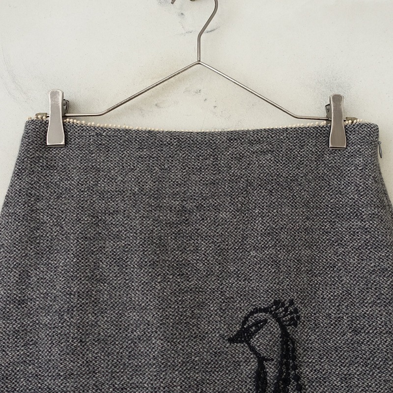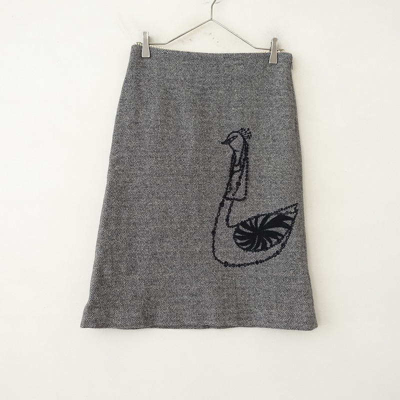 mina perhonenのswan ウール刺繍タイトスカートです。カラーはグレー×ブラックのミックスの起毛地で、ブラックのスワンの刺繍が大胆にあしらわれております。ウエスト周りはライトベージュの玉刺繍があしらわれており、裏地付き、左腰のファスナー開閉で着脱できます。 |