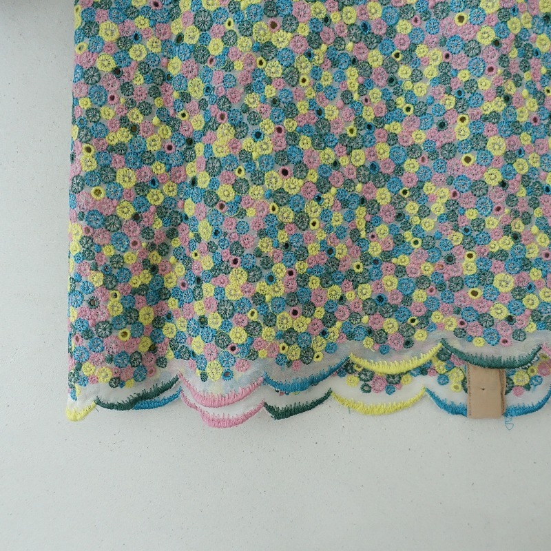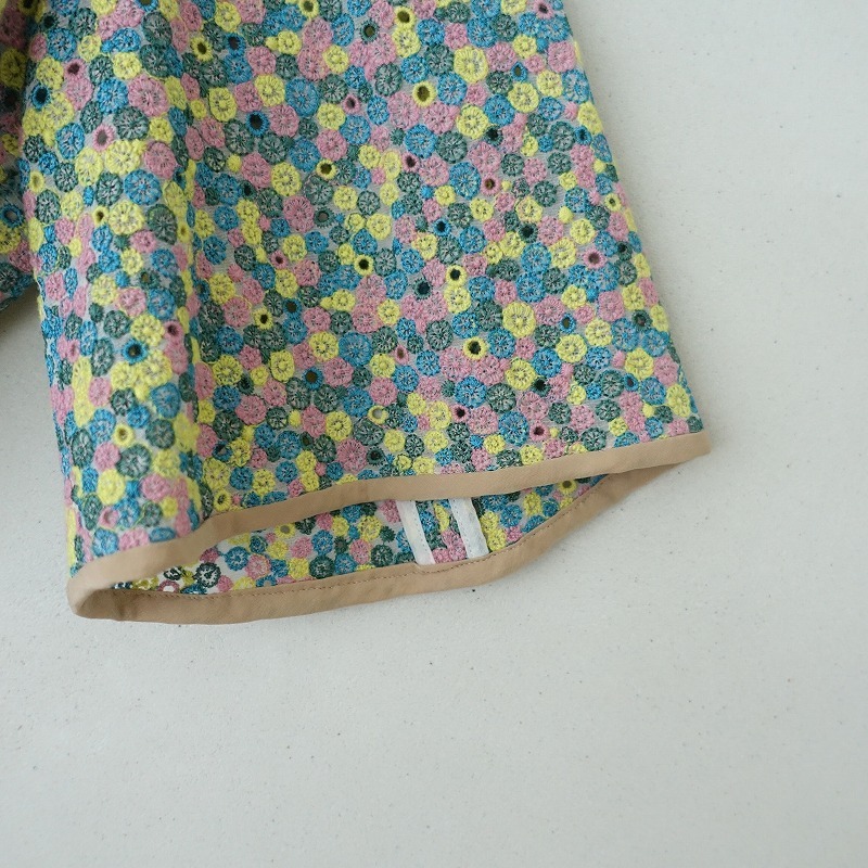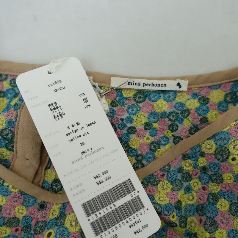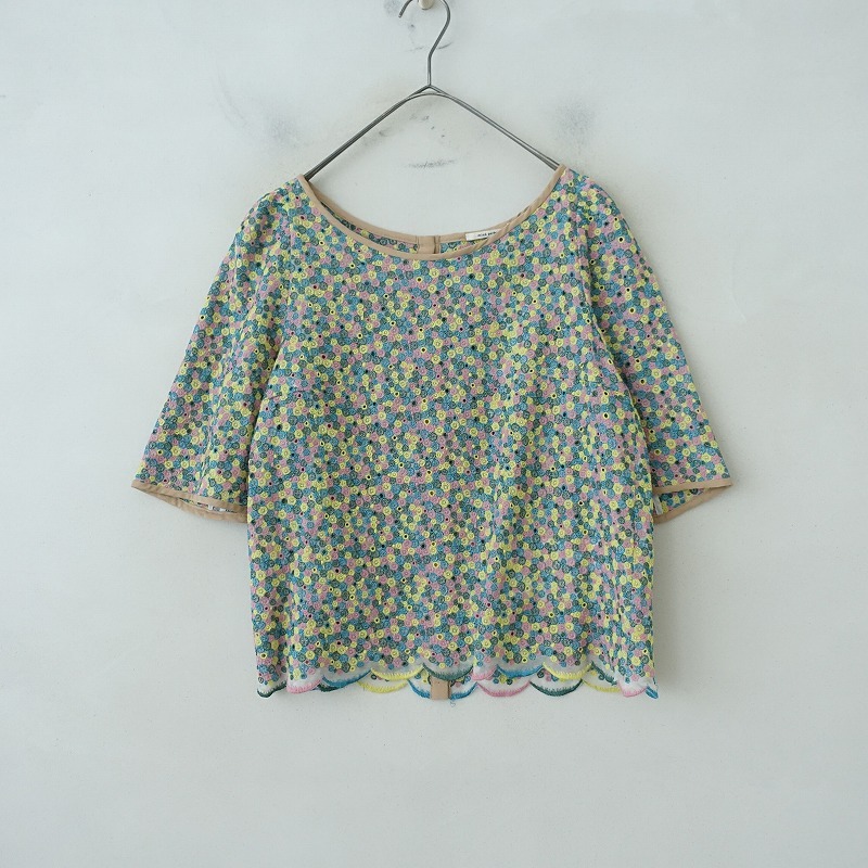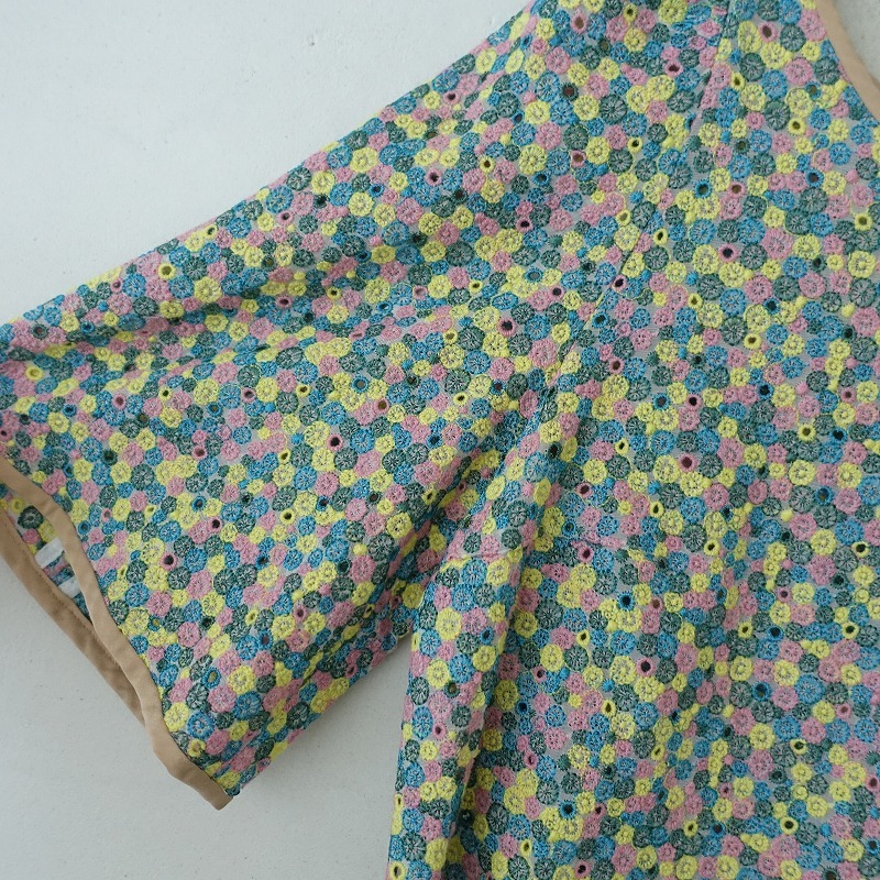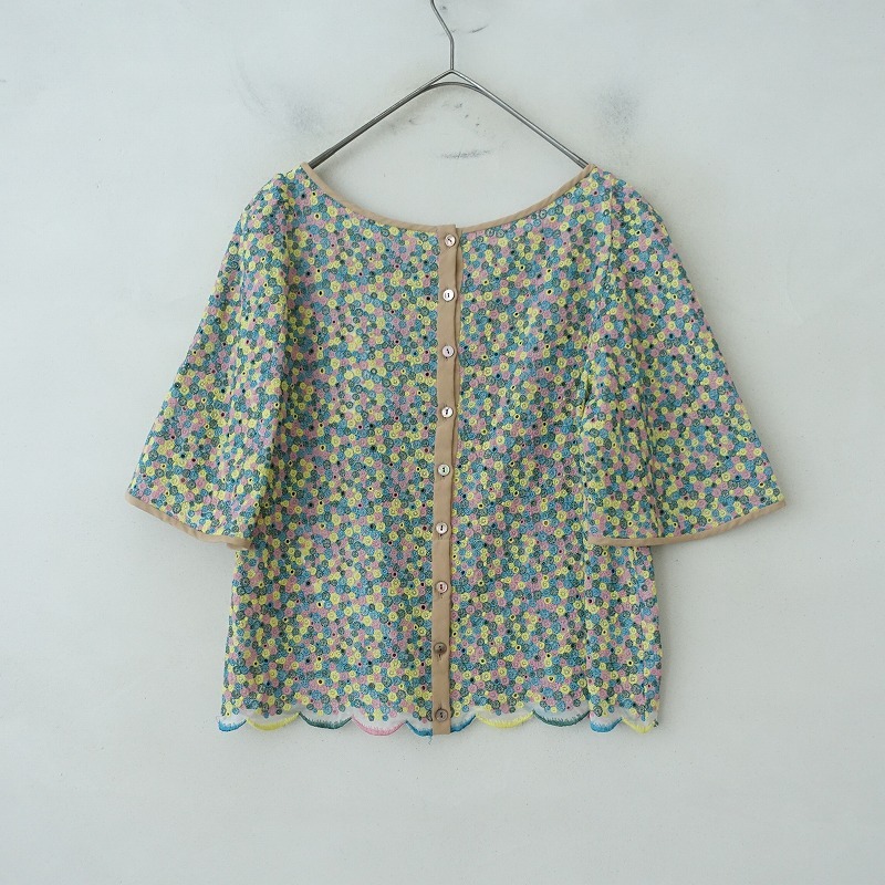 mina perhonenのskyful 刺しゅう後ろボタンブラウスです。カラーはホワイトのシルク地ベースに、ピンク、グリーン、イエロー、ブルーなどのskyfulのテキスタイル刺しゅうがあしらわれたデザインです。後ろボタン開閉で、裾はスカラップラインのデザインです。 |