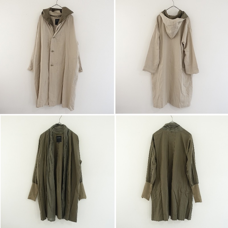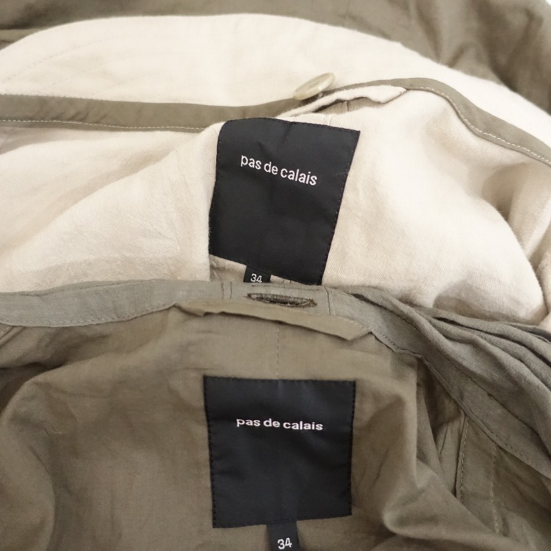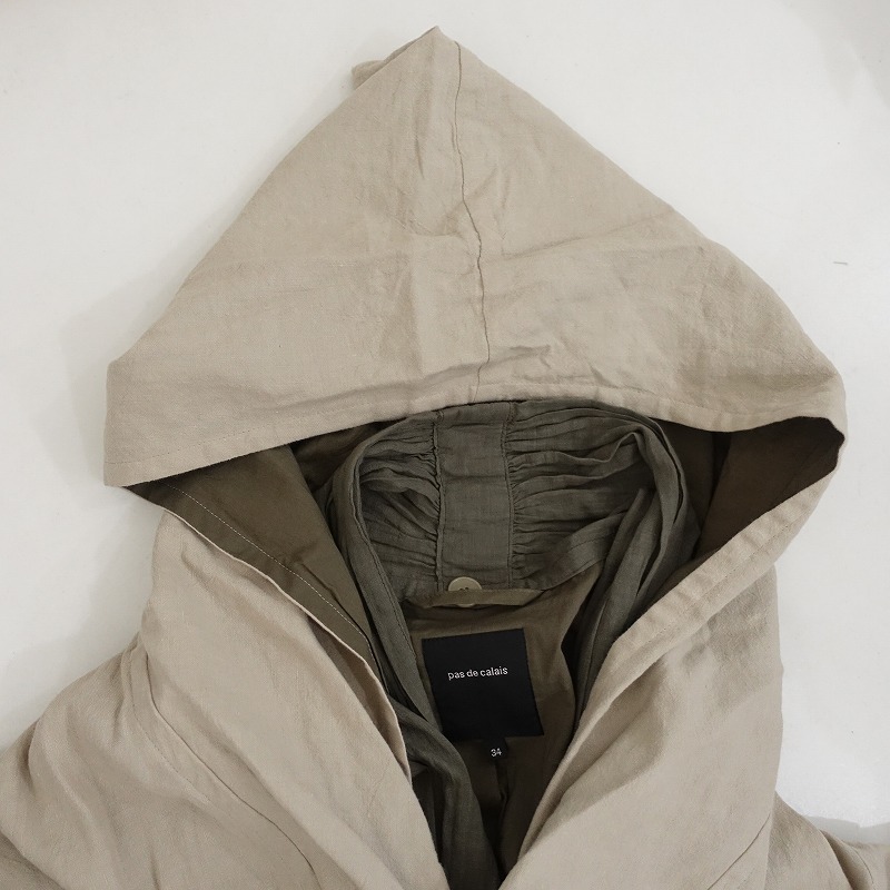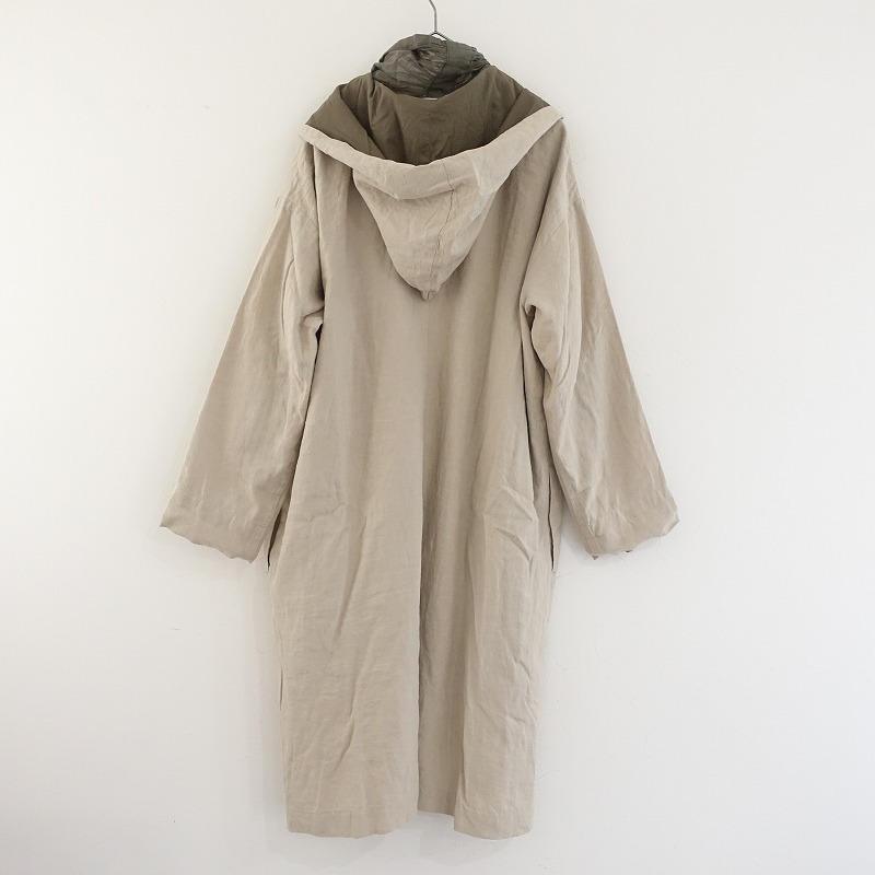 | pas de calaisの3WAYアイリッシュリネンコートです。カラーはライトベージュ&カーキグリーンです。ナチュラルな風合いの麻綿生地を使ったフードカラーのコートと、薄手の綿麻布帛のボタンレスライナーとの重ね着で、それぞれ個々の着用も可能な3WAY仕様です。フードの内布はインナー生地と同素材です。重ね着時にチラッと見えるライナーのショールカラー部分は甘織り素材、袖口はリブニットカフスの裁ち切り仕様です。アウターには両サイドにシームポケットがございます。定価(メーカー希望小売価格)53,900円の商品です。 |