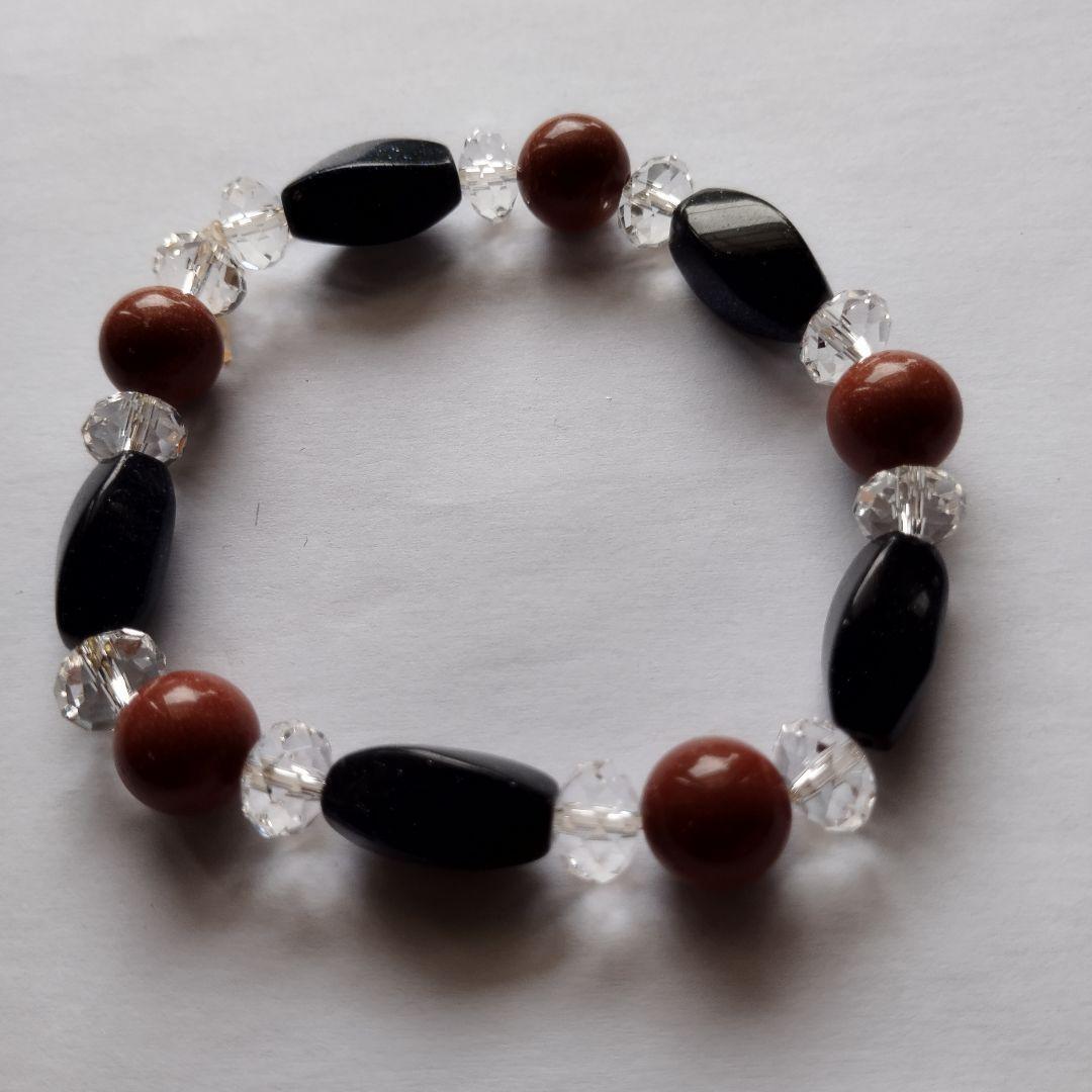 シックなブラックと暖かみのあるブラウンが組み合わさった、ユニークなデザインのブレスレットです。
