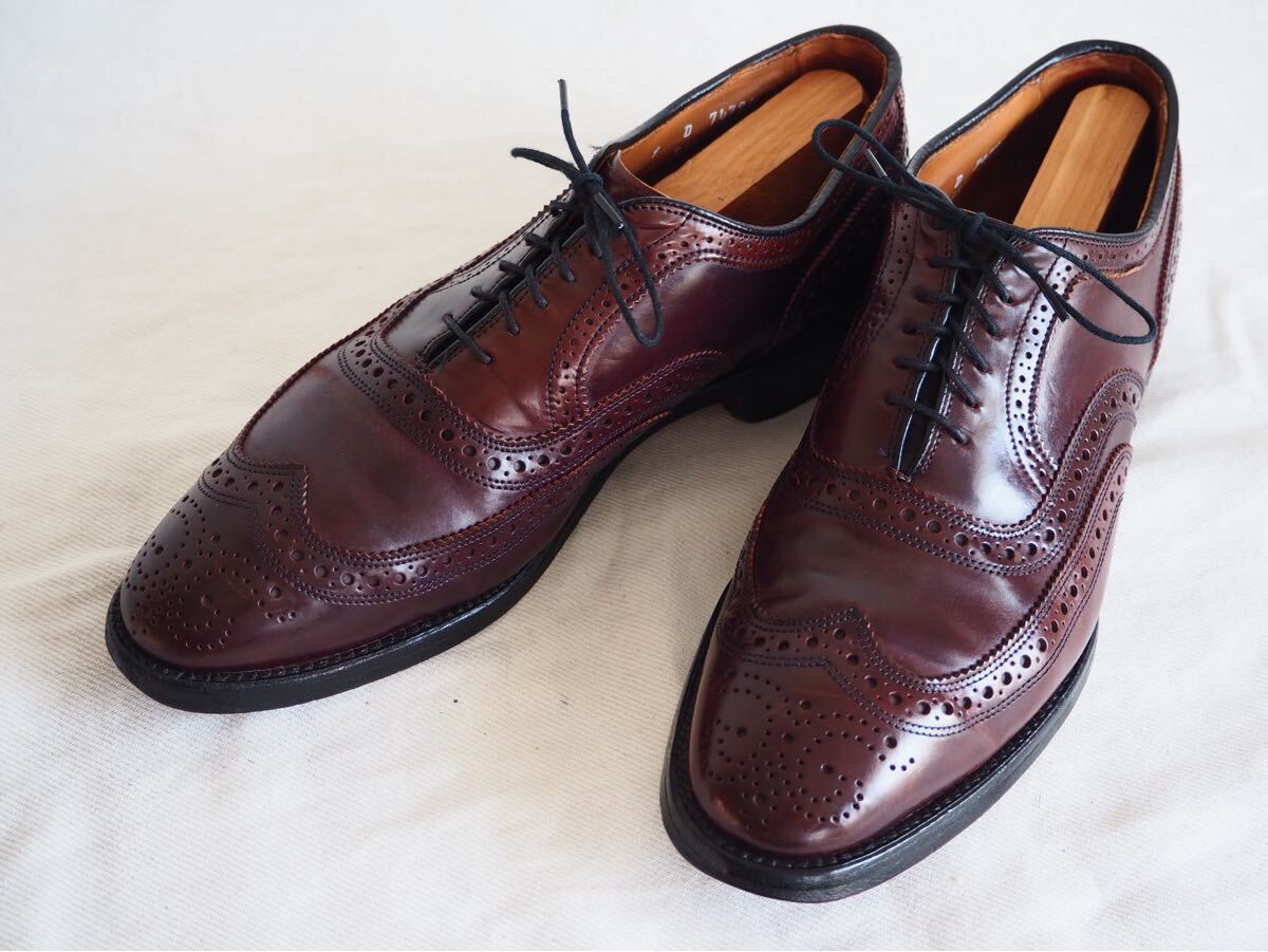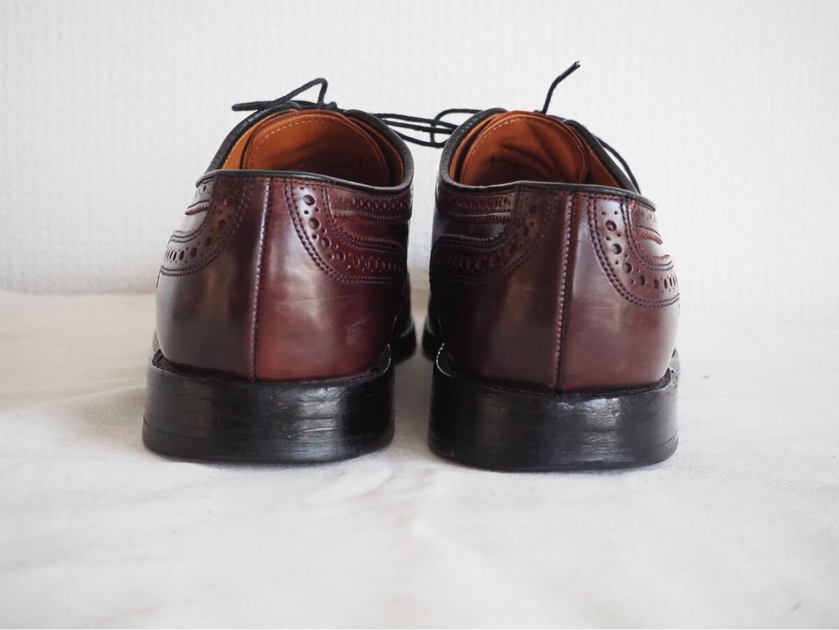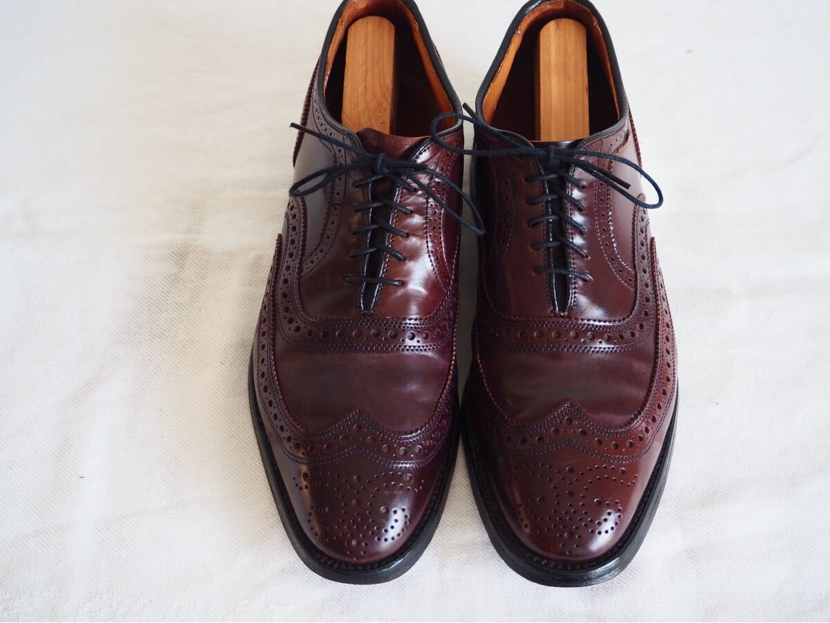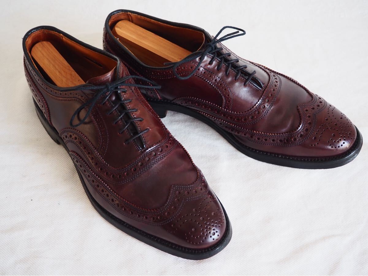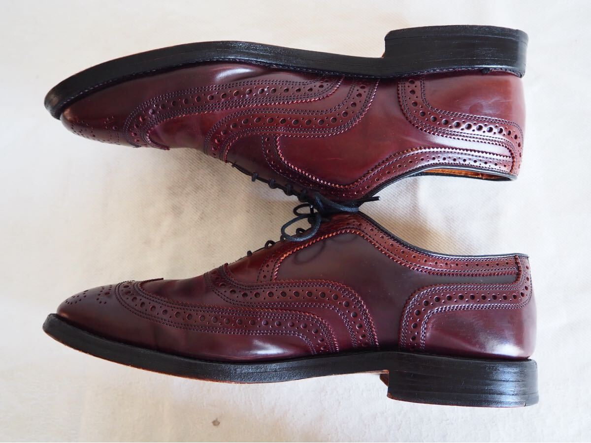アレンエドモンズのコードバン・ウイングチップモデル・ケンブリッジ(8685 Cambridge)だ。こちらは、ソックシートのデザインからして90s→00sのペアと思われる。オールデンの974ショートウイングより、シャープな印象で、ドレッシーな雰囲気をもつ。現行のケンブリッジとディーテールは変わらないが、パンチングやパーフォーレーション・ピンキングなどやや小さめに施されている。現行ペアより品のある佇まいだ。また、アレンエドモンズはオールデンと同様にアッパーにはホーウィン社シェルコードバンを使用しており、深い輝きと素晴らしい光沢が特徴だ。是非この機会に手に入れてみてはいかがだろうか?