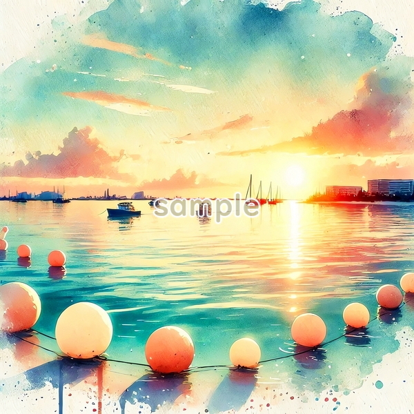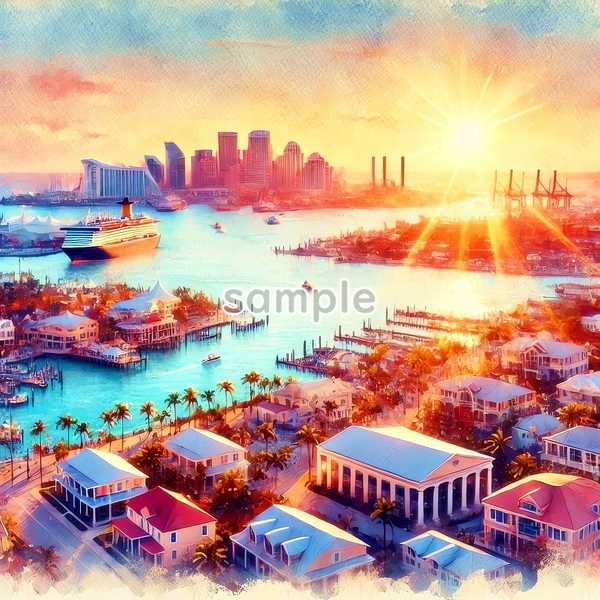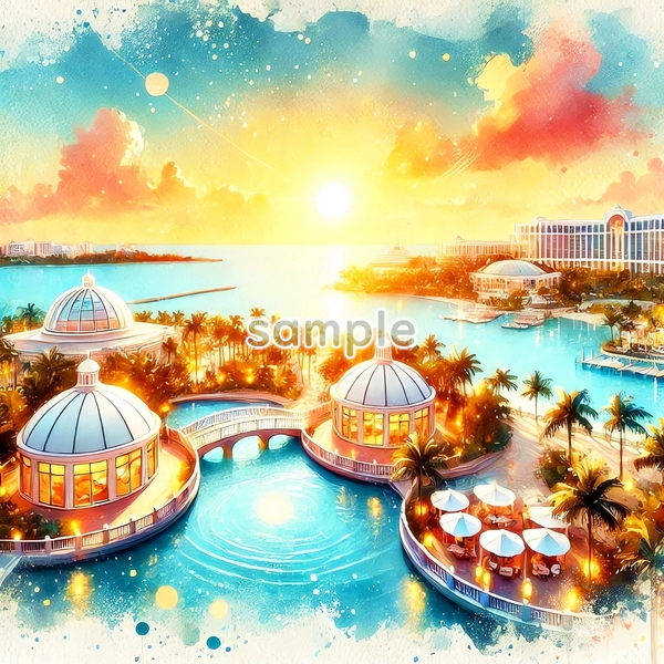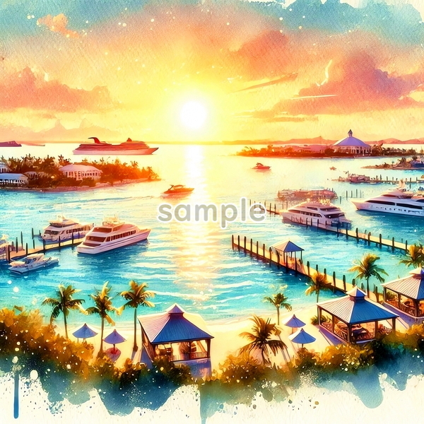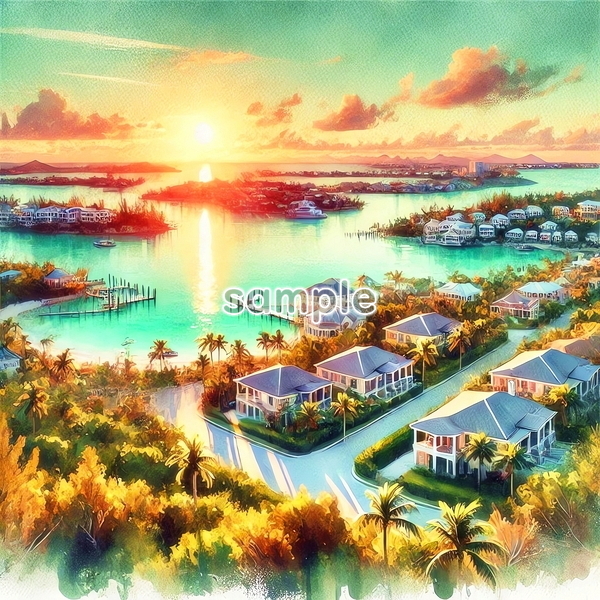 | バハマ 世界国景色 緑と夕日と光 水彩 オリジナル絵イラスト 154P Bahamas World country scenery green sunset light watercolor Original painting art picture image material |