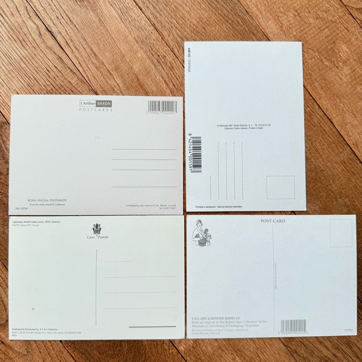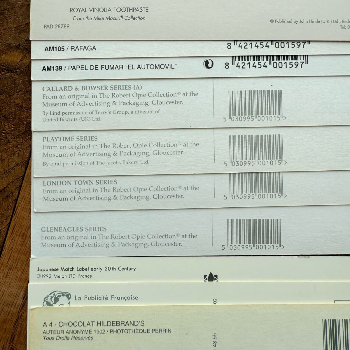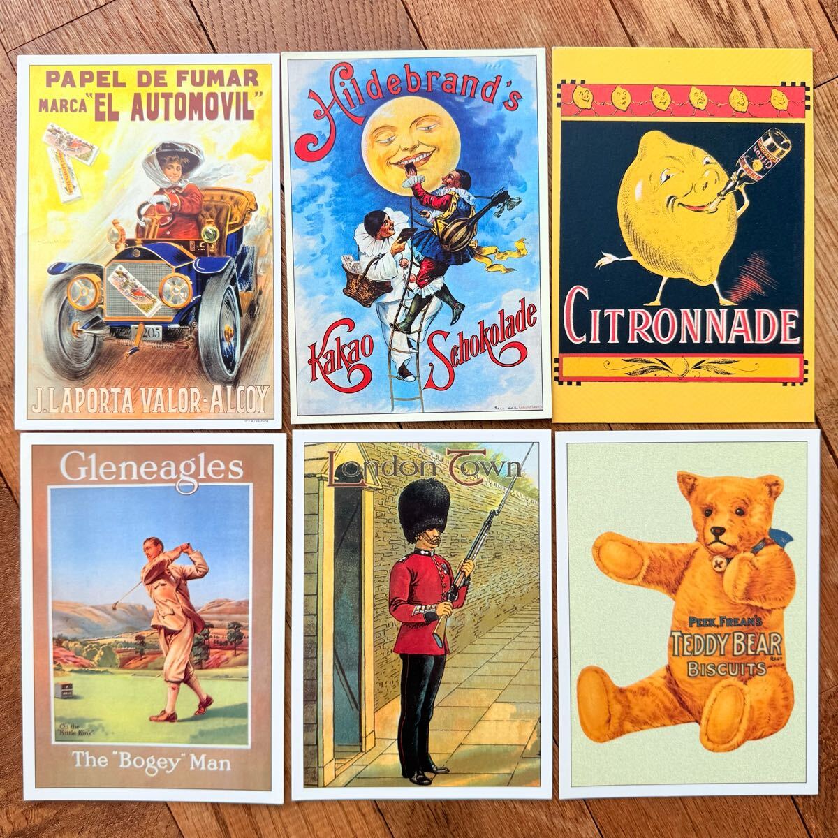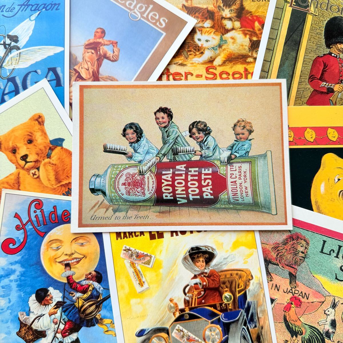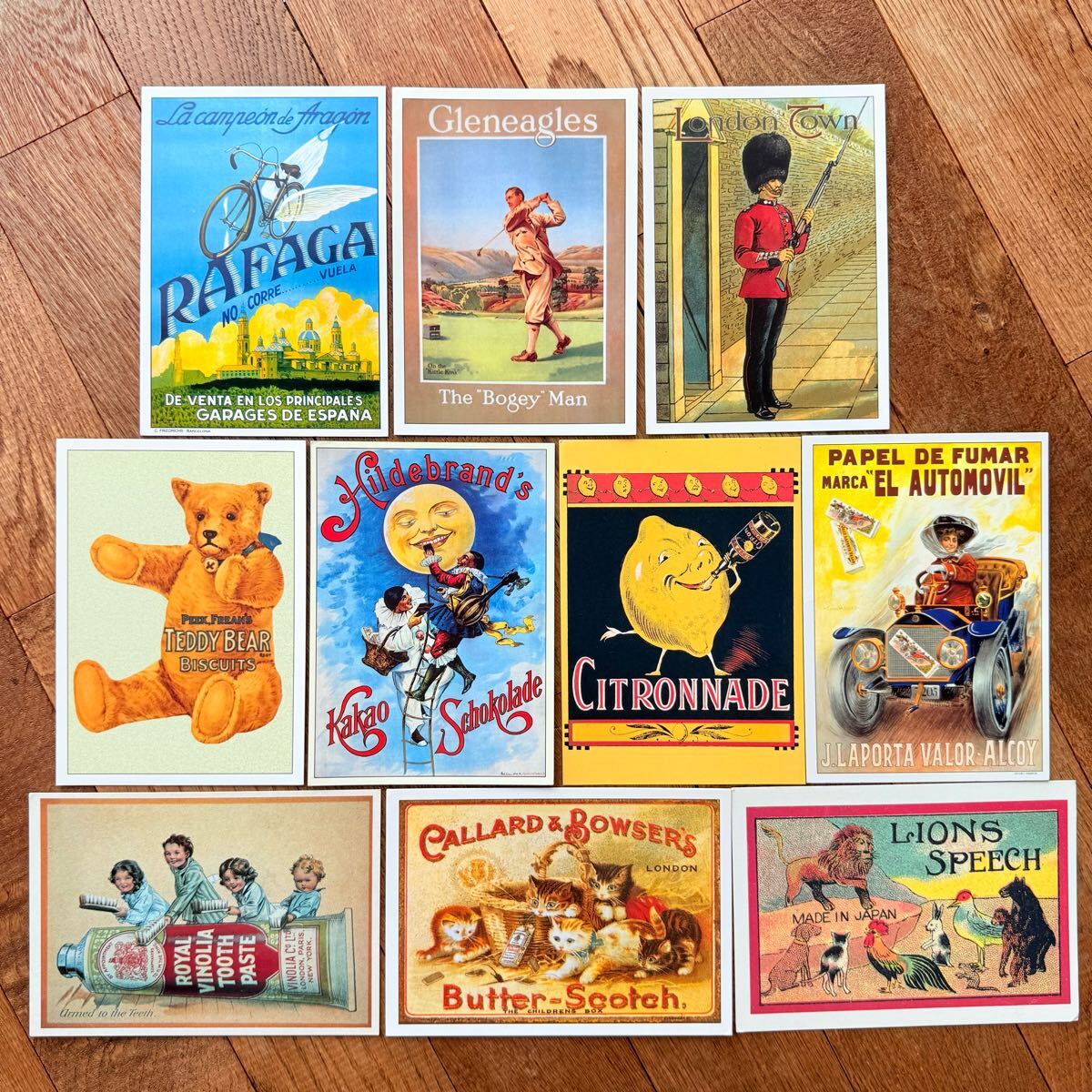 ご覧いただきありがとうございます。こちらは、ヴィンテージ広告やレトロパッケージをモチーフにしたポストカードセットです。自転車広告「RFAGA」、英国グレネイグルズのゴルフ広告、ロンドン衛兵のイラスト、テディベアビスケット、レモネード広告、初期の自動車関連広告、マッチラベル、日本製ライオンスピーチラベルなど、多彩なデザインが揃っています。ロバート・オピーコレクション(Museum of Advertising & Packaging, Gloucester)やフランス、スペインなど各国の資料を基にした復刻カードです。