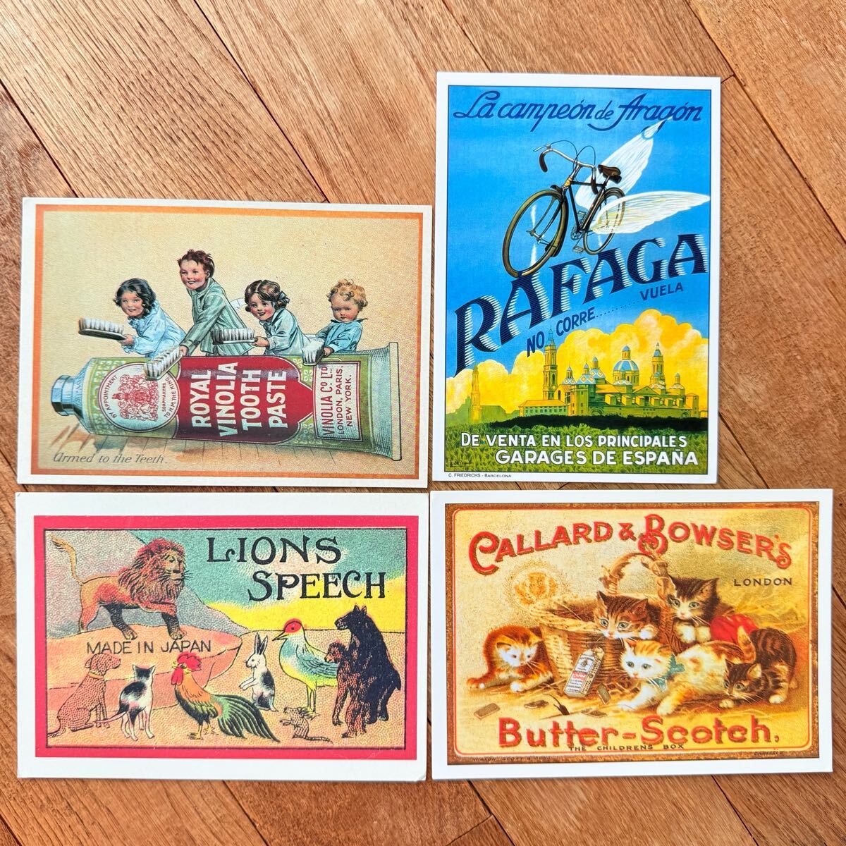 ヴィンテージ ポストカード レトロ広告 自転車 グレネイグルズ ロンドン衛兵 テディベア ビスケット 自動車広告 マッチラベル レモネード 英国雑貨 フランス雑貨 スペイン広告 ライオンスピーチ RobertOpie コレクション資料 復刻カード アンティーク風 ディスプレイ