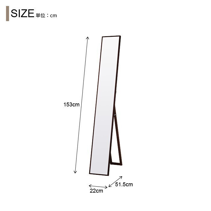商品説明 | 職人が丁寧に製造したこだわりの日本製。 【仕様】 ■サイズ:約幅22×奥行38~51.5×高さ153cm ■重量:約3.8kg ■材質:天然木、ミラー(3mm厚) ■塗装:ウレタン塗装 ■カラー:ホワイト、ナチュラル、ブラウン ■機能:天然木細枠フレーム、飛散防止加工ミラー、折りたたみ可能 ■生産国:日本 ■組立区分:完成品 |