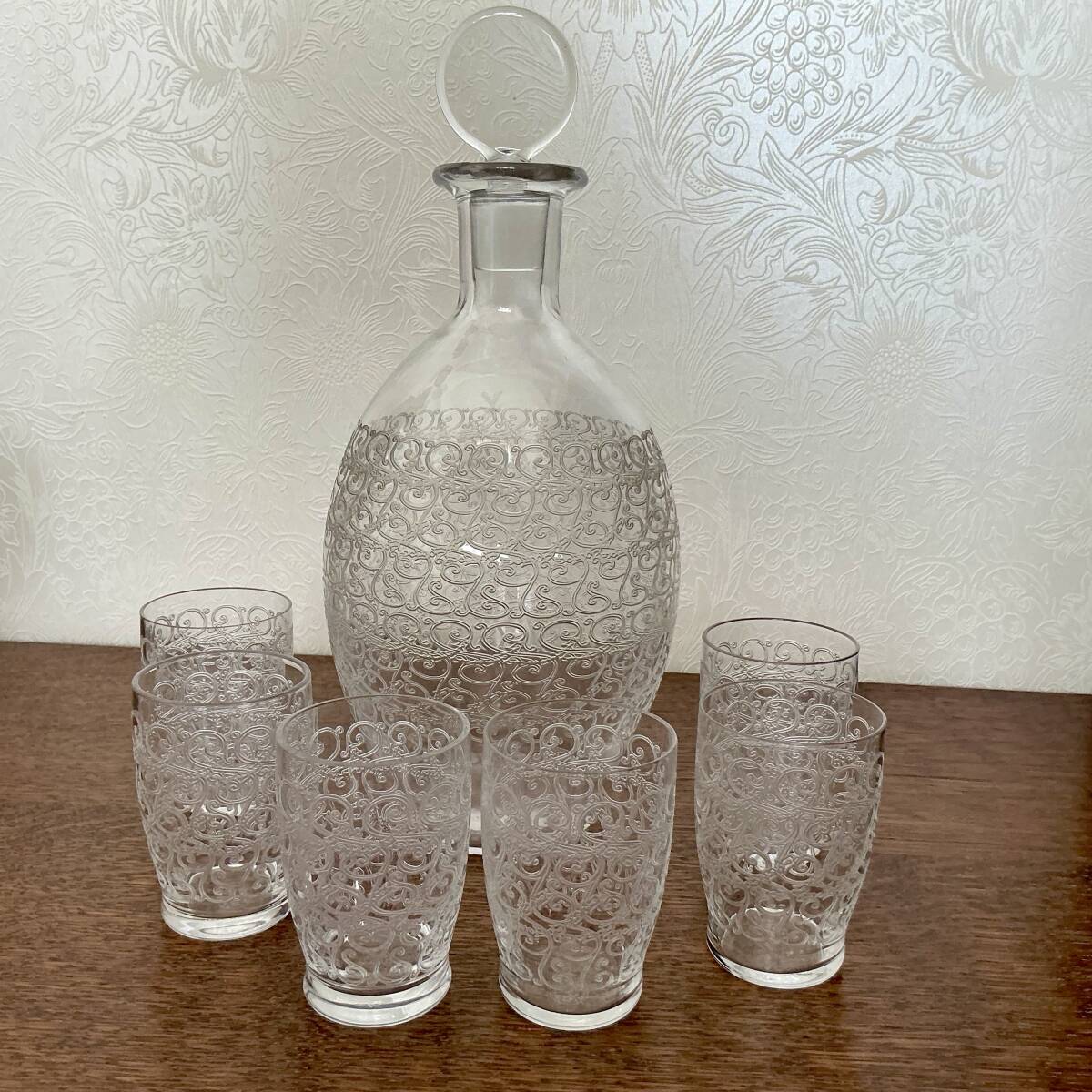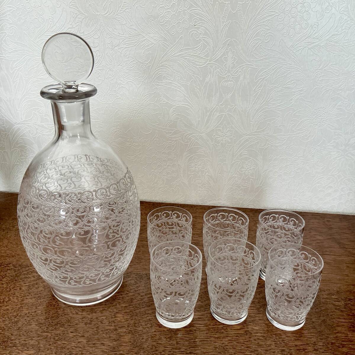 バカラ ローハン グヴィユー  デカンター  & シェリー グラス 6客 セットの出品です。ローハンはバカラで製作されるグラスの中でも最も人気のあるグラスの一つで、胴廻り全体にバカラの代表的な装飾技法アシッド・エッチング(酸化腐食法)でS字型のアラベスク模様が繊細にグラヴィール描かれています。