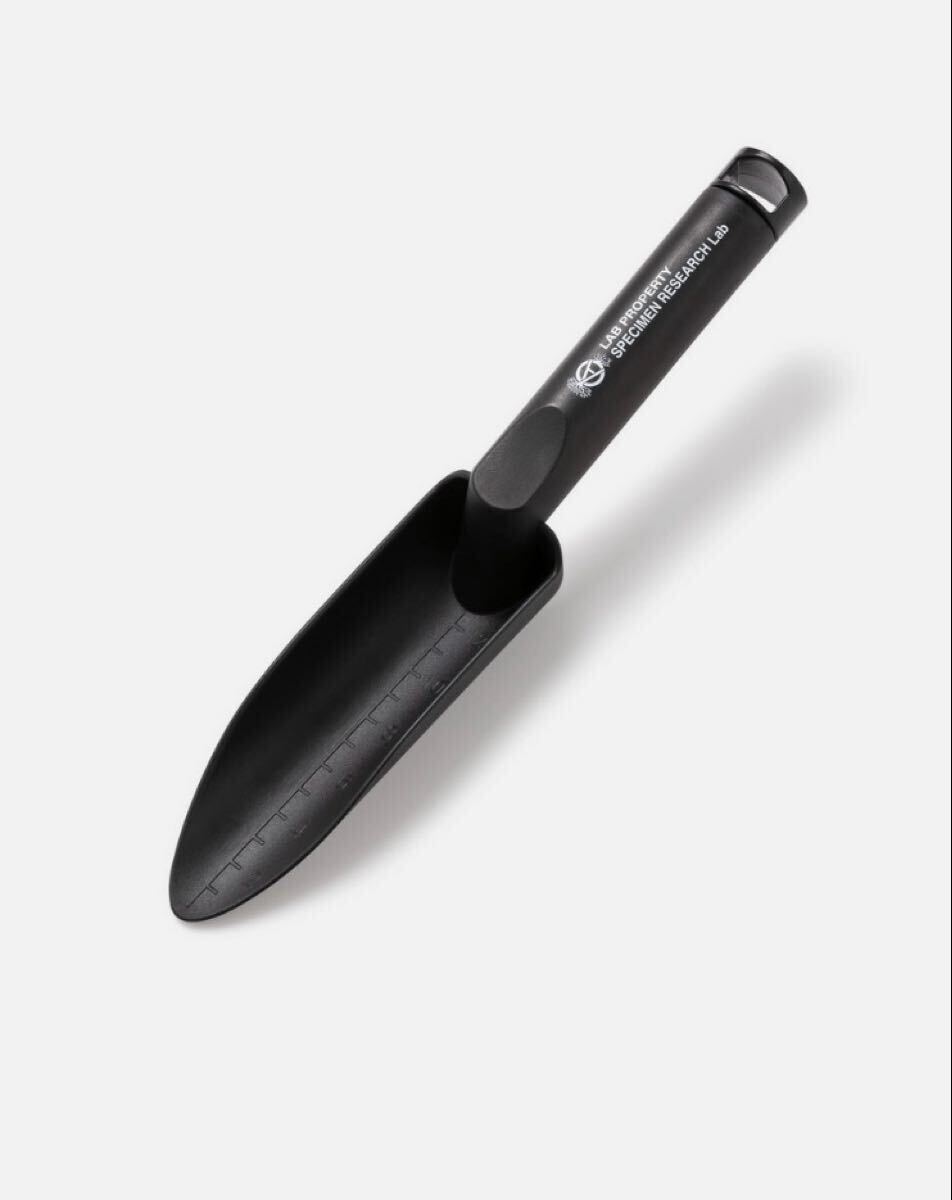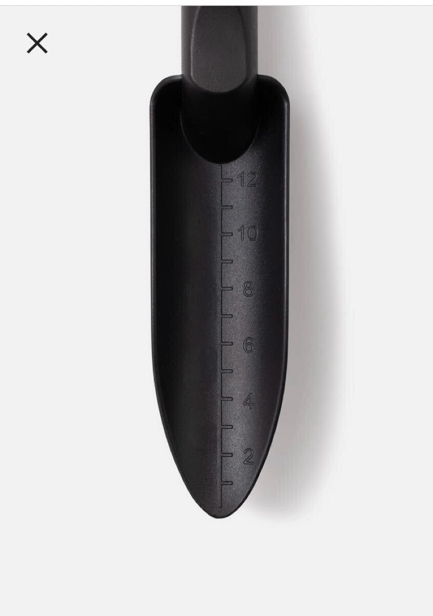 柄の部分にSRLのロゴをプリントした、植え替え用のスコップ。内側に目盛り付き。持ち手部分の穴に紐やリングを通すことで、フックなどに掛けられる仕様。ポットと植物の隙間に土を入れるのに適したSサイズ。