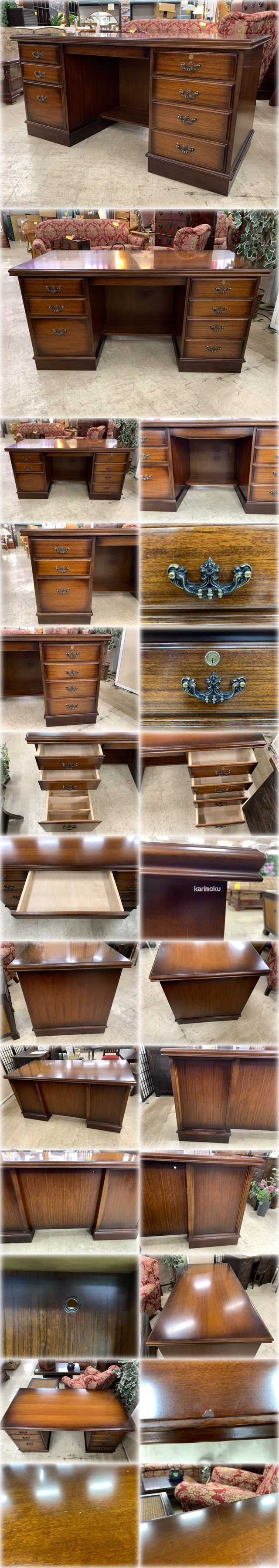 カリモク 両袖机 コロニアルシリーズ を出品いたします。 ■特徴■ ”100歳の木を使うなら、 その年輪にふさわしい家具をつくりたい”を モットーとしその造りの良さで高い評価を得ている、 高級家具メーカーカリモクより 書斎向けの両袖机を出品します。 カリモクは、昭和22年(1947年)創業の日本を代表する 国内シェアNo.1の家具のトップメーカーです。 カリモクの本物の木の家具には、温もりがあります。 優しい肌触りの木肌、美しい木目には、 心を癒してくれるチカラがあります。 カリモクは、”100歳の木を使うなら、 その年輪にふさわしい家具をつくりたい” を 合言葉とし、これからも木と語り合いながら、 “お客様に愛される家具”をお届けしたいと願っています。 木材の"狂い””割れ”を防ぐ 優れた乾燥技術、熟練した職人の技と エレクトロニクス技術を融合させた高度な造形力・・・。 カリモクでは、一つ一つの工程が果たす責任こそが 確かな品質を築く絶対条件と考え、 各工程でじっくりと検証を重ね、 すべてをクリアした製品だけが世に送り出されています。 無駄のないシンプルなデザインは 洗練されたセンスが光り、 上質な雰囲気、上品な色調でこころ休まる ナチュラル感覚の空間つくりにをうってつけです。 出品商品の両袖机は、 アメリカ伝統の家具様式をモチーフにした カントリーファニチャー、 コロニアルシリーズです。 古き良き新大陸の田園生活を思い起こさせる、 ノスタルジックなテイストが魅力のポイント。 親しみやすいデザインと温もりのある色調の コロニアルウォールナット色が、 暮らしに素朴な優しさを運び込んでくれます。 独特のボカシ塗装仕上げで木部の陰影を強調。 木質感を引き立てながら、 使い込まれた木肌のアンチークな 風合いを表現しています。 左袖の最下段の引出しには かさばる書類でも出し入れが楽な スライドレール付です。 天面等にややキズや打痕はあるものの、 使用に差し支えありません。 写真に写っている周りのものは付属しません。 鍵はありません。 発送はアート家財おまかせ便でお送りします。 送料軽減のため弊社まで 直接引取りに来て頂ける方も歓迎です。 定価124,500円の非常に高価な商品です。 格安出品いたしますのでこの機会をお見逃しなく! |