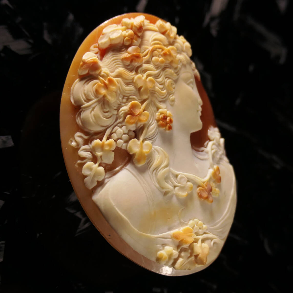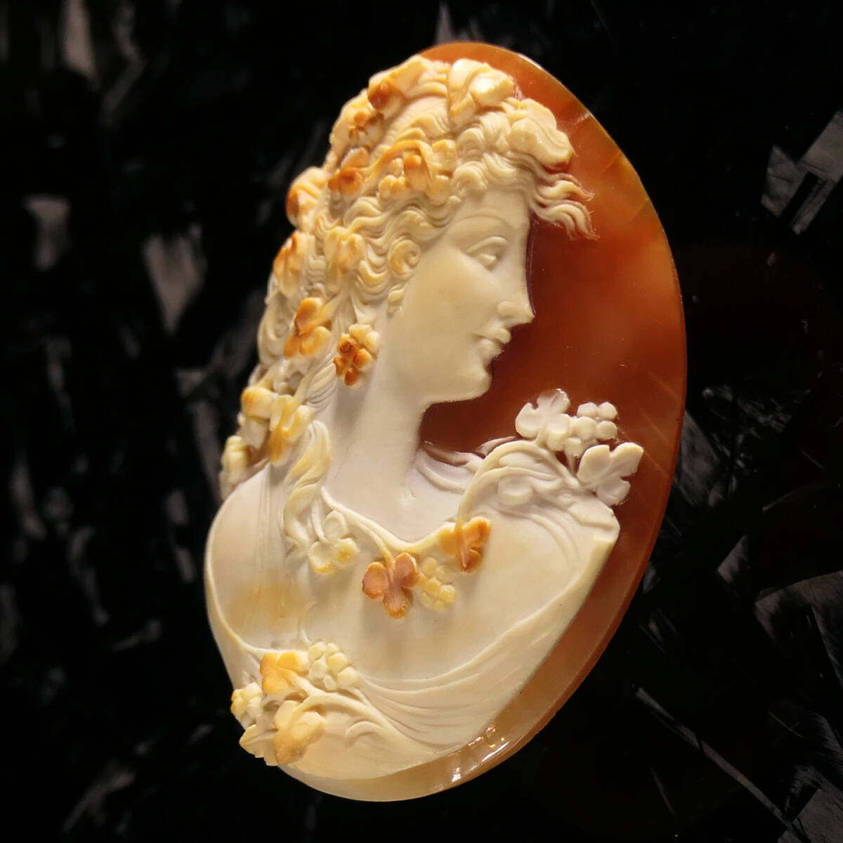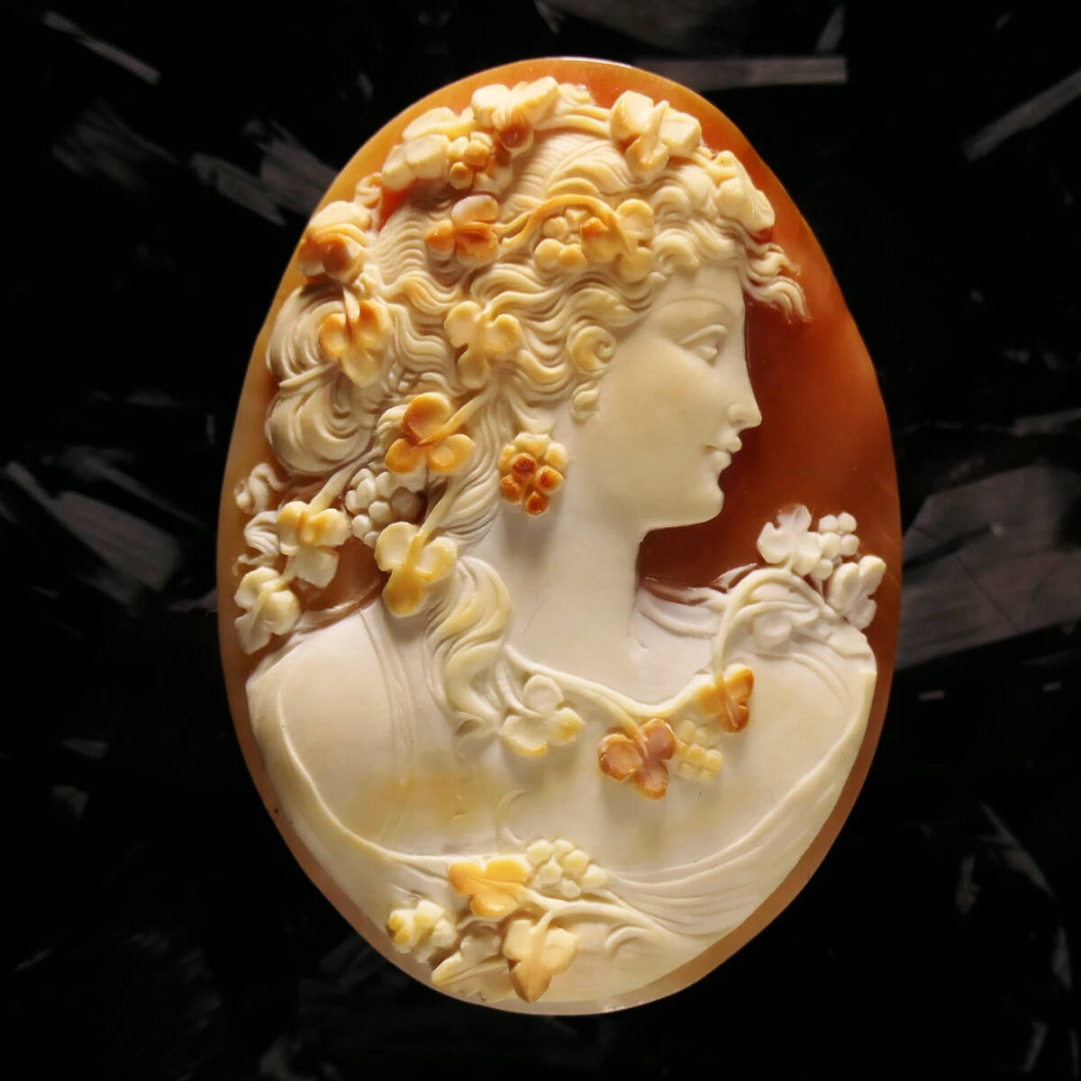 顔つきが合作カメオに多い弟子の彫るものと同じなので合作と鑑定しておりますが、後述します通り合作カメオの中でも間違いなく最高レベルの逸品。