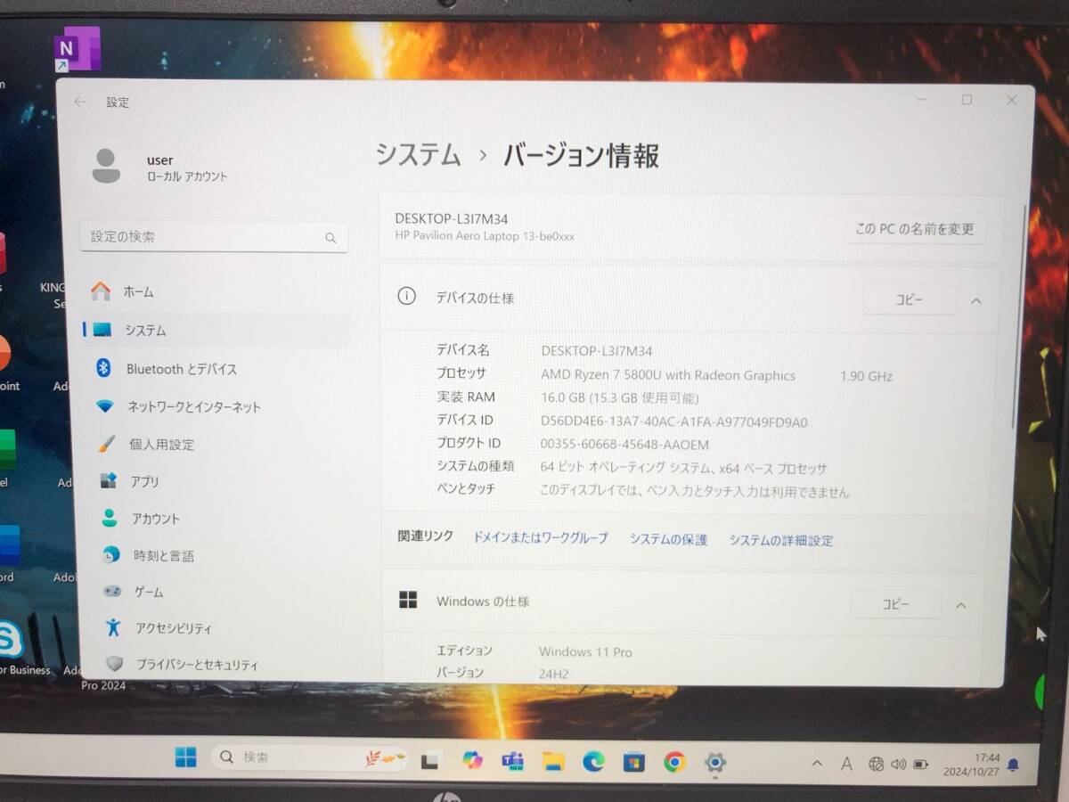 | CPU | AMD RyzenTM 7 5800U モバイル・プロセッサー + RadeonTM グラフィックス |