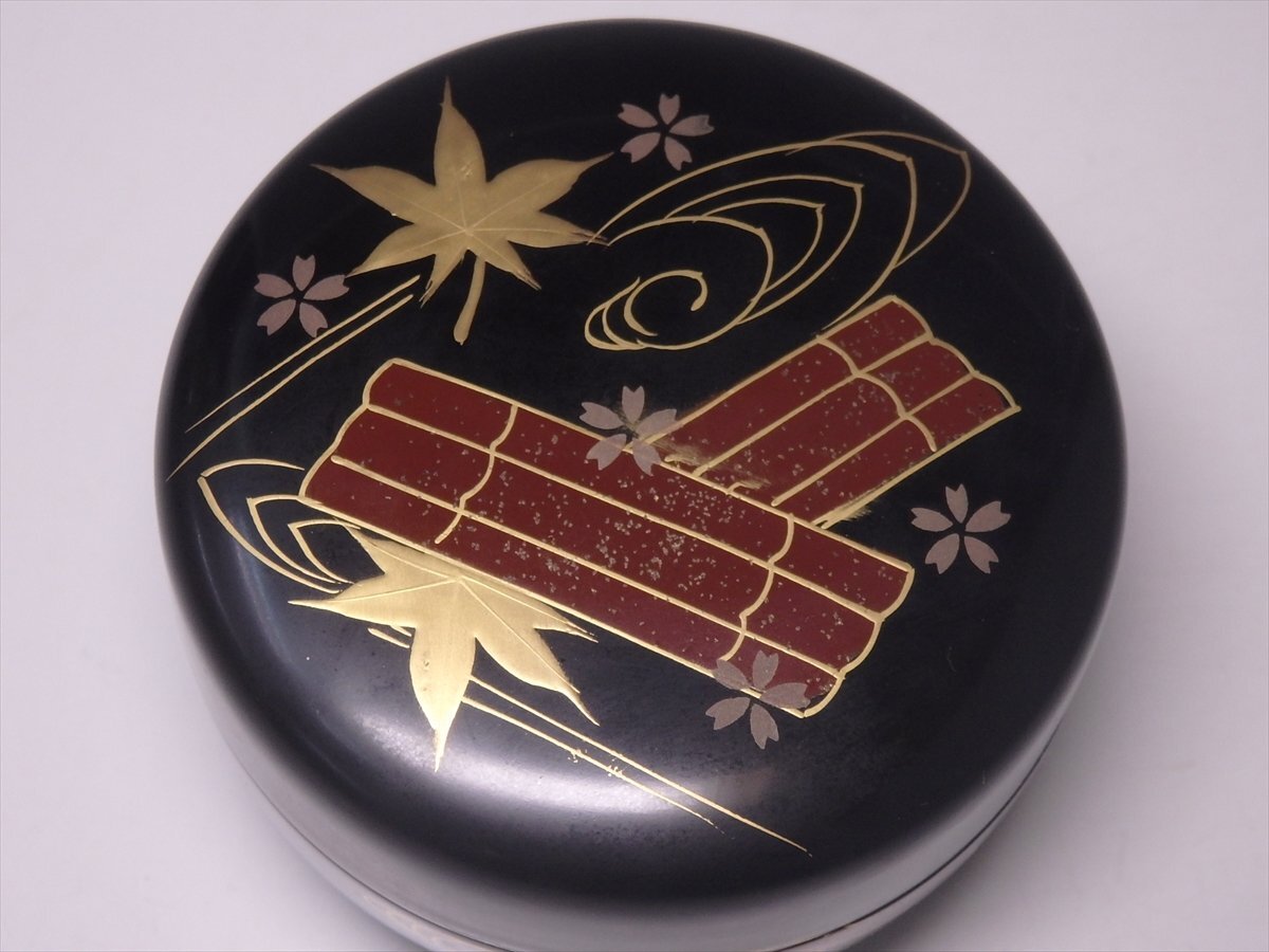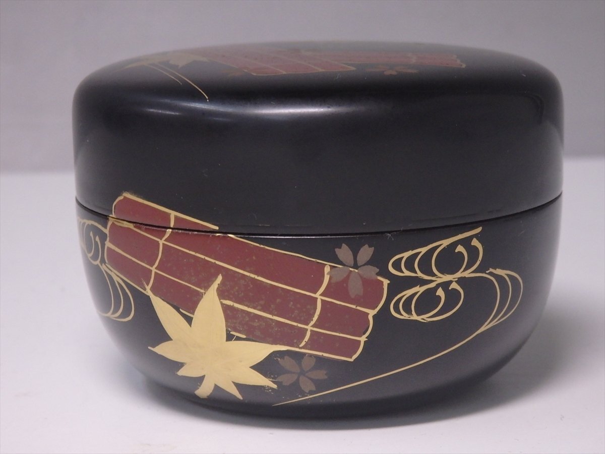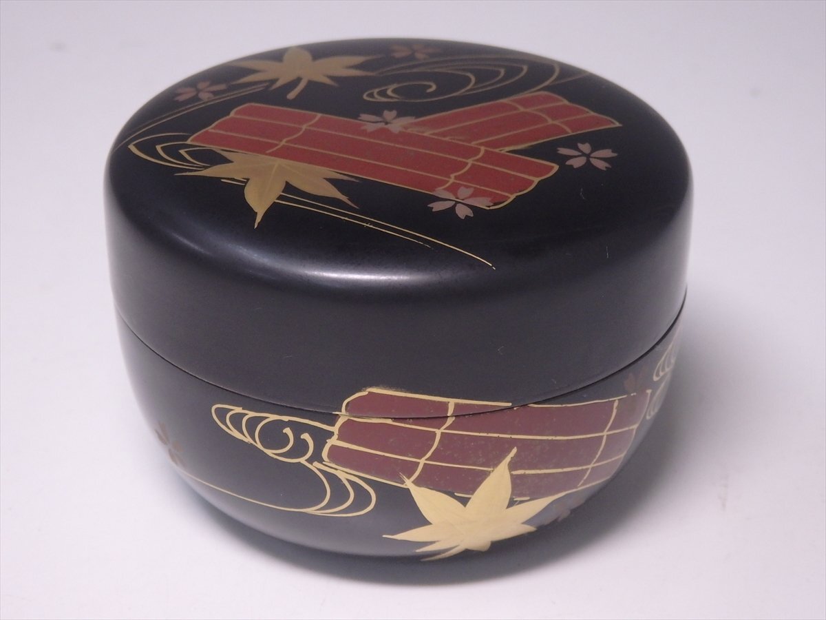 ★木製【花筏蒔絵 平棗】セール! レトロ 漆器 直径7.8×高さ5.3cm 春の桜 秋の紅葉 茶道具 茶器
