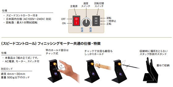 ロッドビルディングのコーティング・乾燥の必需品、フィニッシングモーター。 スタンドの形状・素材が変わりました。 スチール製からステンレス製に、耐久性アップ! ブランクス外れ落ち防止ゴムリング仕様 待望のコントローラー付きフィニッシングモーターが新登場! 新機能が追加され初心者からプロまで誰でも快適に使える! コントローラーには、停止-低速-最大1分間60回転の高速まで、速度を微調整できるダイアル式スイッチ、 回転方向を変えるスイッチ、電源、3つのスイッチを搭載。 より快適なコーティング作業を追求した新機能は、仕上がりを各段に向上させ、 作業時間も大幅に短縮するでしょう。 ご使用前には必ず付属の取扱説明書をよくお読みください。 (対応ロッド) (画像のロッドは付属していません。)