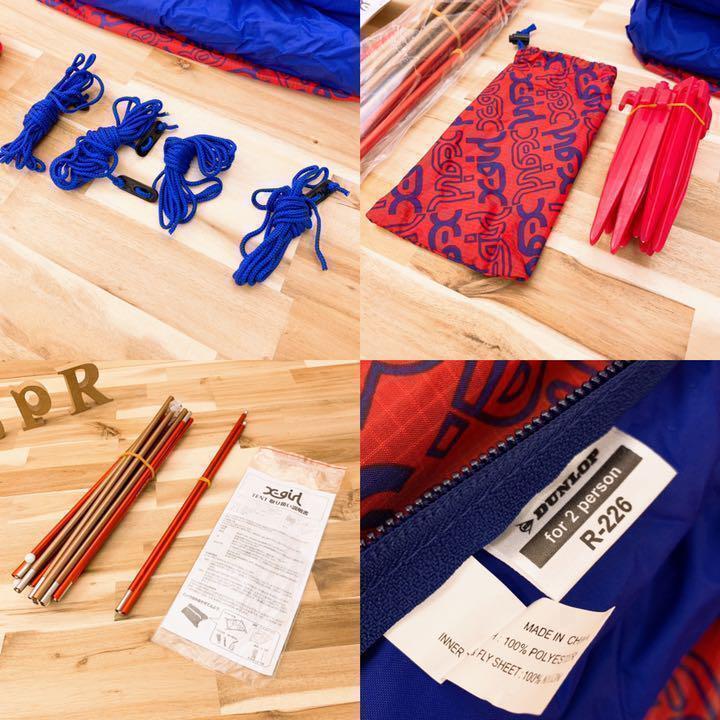 * コンパクト *ブランドロゴが全体に散りばめられた、20周年を記念して限定的に製造、発売された貴重なX-girlのテントです。女子会かねてのちょっとしたキャンプやツーリング、アウトドアや登山、釣りフィッシング、フェスなどで活躍してくれると思います。コンパクトになるのでバイクに取り付けたりすることも可能。持ち運びも楽です。製造元は、DUNLOP。helinoxで有名なDAC社のポールが採用されているので安心してご使用いただけるかと思います。
