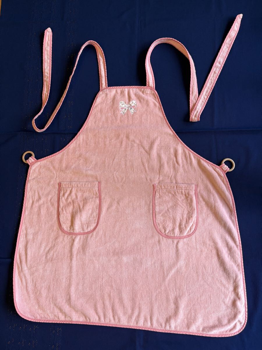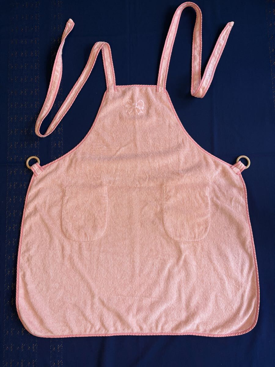 リボン刺繍が施されたサーモンピンクのタオル、生地、エプロン2つのポケット付きで実用的