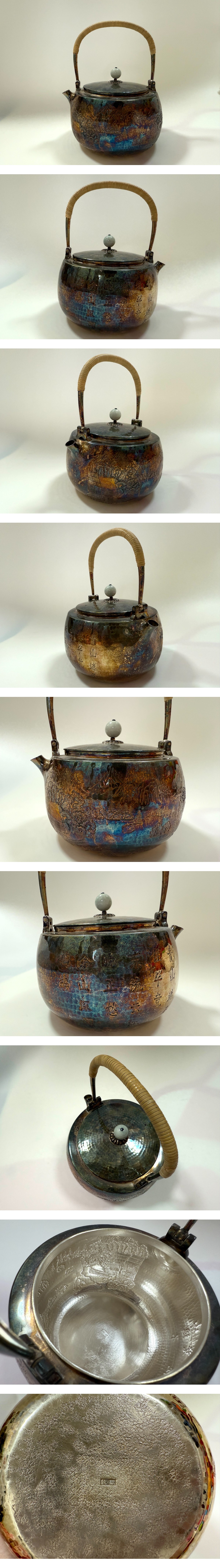時代 純銀製 象嵌 萬千山水図 漢詩文 湯沸 工芸品 古美術品 銀瓶 煎茶道具