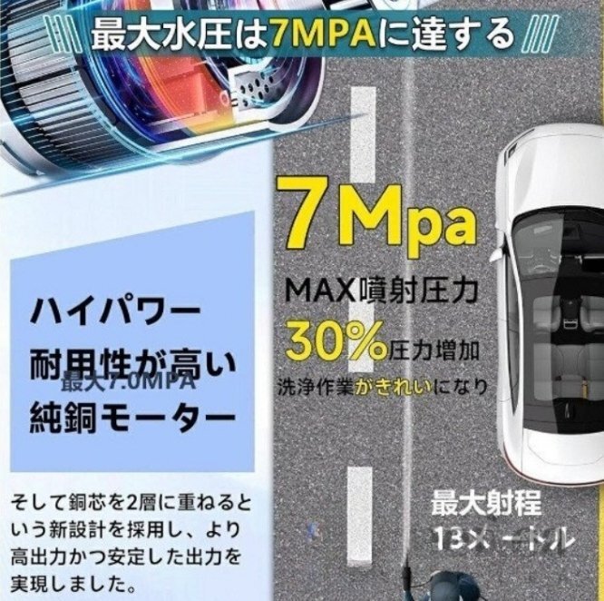 新しくアップグレードされたブラシレス高性能純銅モーターを搭載しており、強力な安定性と耐久性と強力なパワーの効率を向上されます。それに過電流保護、過電圧保護、過熱保護、充放電保護、アップグレードされた高効率プランジャーブースターポンプを取り付けています、駆動力は450ワットで、強力な圧力と安定して稼働できて、市販品より随分長持ち、頑固な汚れでも綺麗に洗えます。