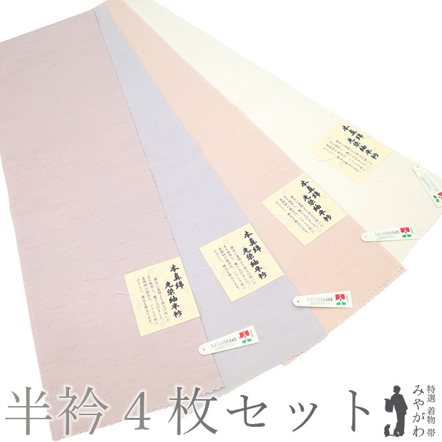 【新古品】 半衿 半襟 未使用 正絹 4枚 セット まとめて 本真綿 先染紬半衿 紬 先染め 白 ピンクベージュ ブルーラベンダー ローズミスト 無地 カジュアル 小物 春 秋 冬 和装小物 オフホワイト ピンク 青紫 赤紫 4色 おしゃれ みやがわ sb54290
