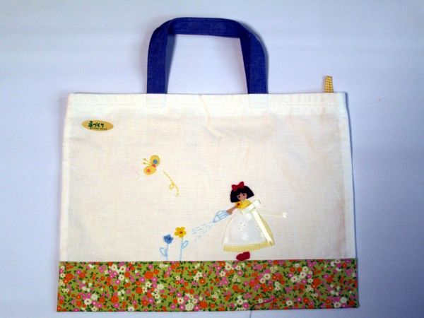 品名:手作りの花と女の子柄のスクールバッグです その他:うら付きで内ポケットもあります。