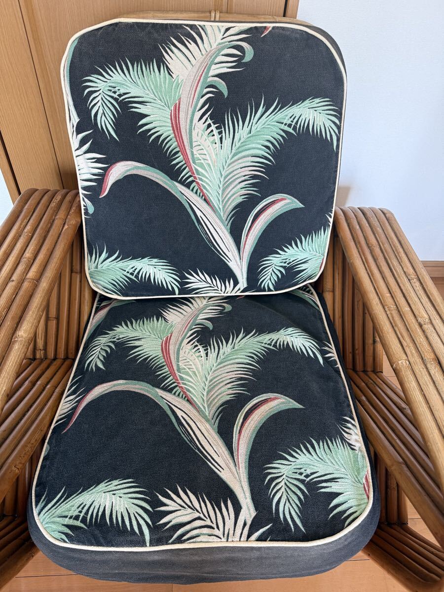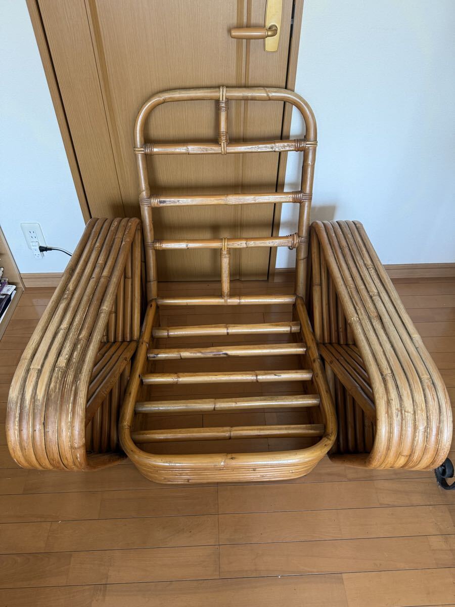 50s のラタンフレームシングルチェアになります。多少の日焼け色褪せはありますが目立つダメージ、穴等見当たらなくこの年代のファブリックチェアにしては状態良いと思います。フレームがとてもカッコよくてファブリックの色、デザインも良いですね。お好きな方いかがですか。直接の引き取りも大丈夫です。配送の場合は家財便で送る予定になります。よろしくお願いします。
