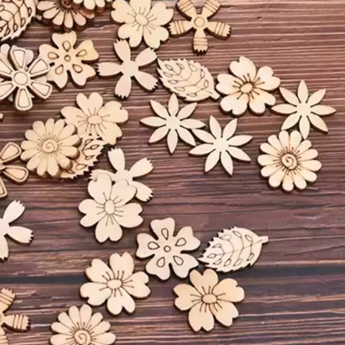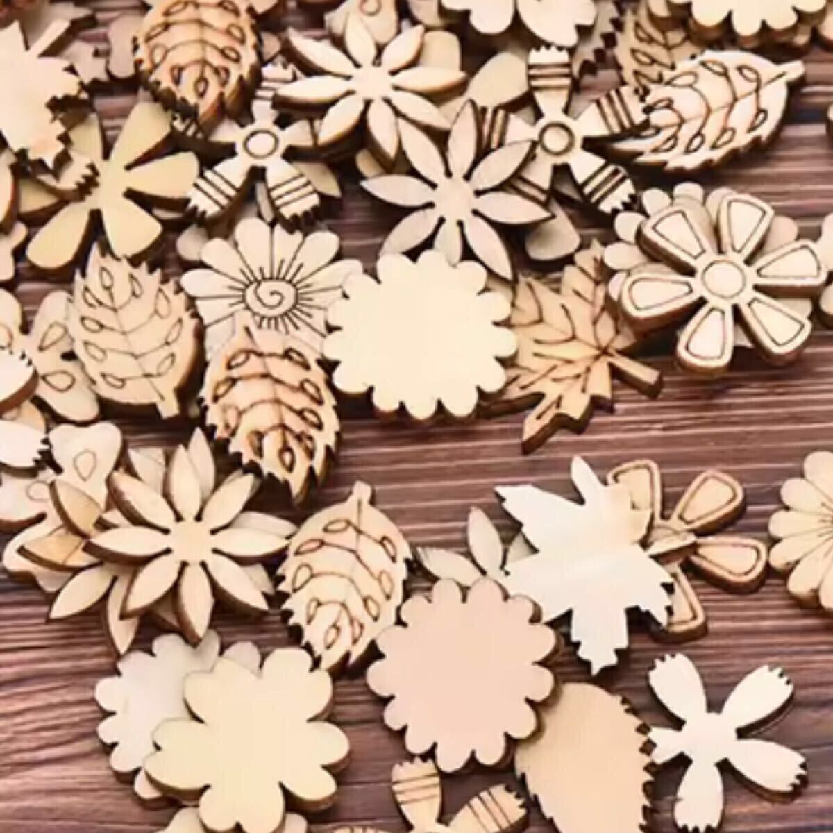 20㎜前後の小さな花や葉が100点。薄い白木を花や葉の形に切り抜いてあります。花や葉の中にレーザーで焼いたような感じで花びらや葉脈が描いてあります。そのままでも置物(インテリア)になりそうですが、トールペイントの材料にするのがオススメです。またキリなどで穴をあけて紐を通せば、クリスマスなどのオーナメントやアクセサリーに加工もできそうです。利用方法いろいろです。送料無料。値下不可商品です。よろしく御願い致します。
