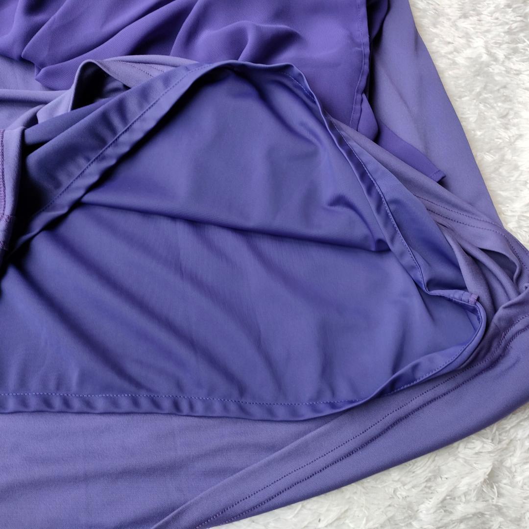 台形のシンプルな形のワンピースの前方に透け感あるシフォンが下がっているデザインです。