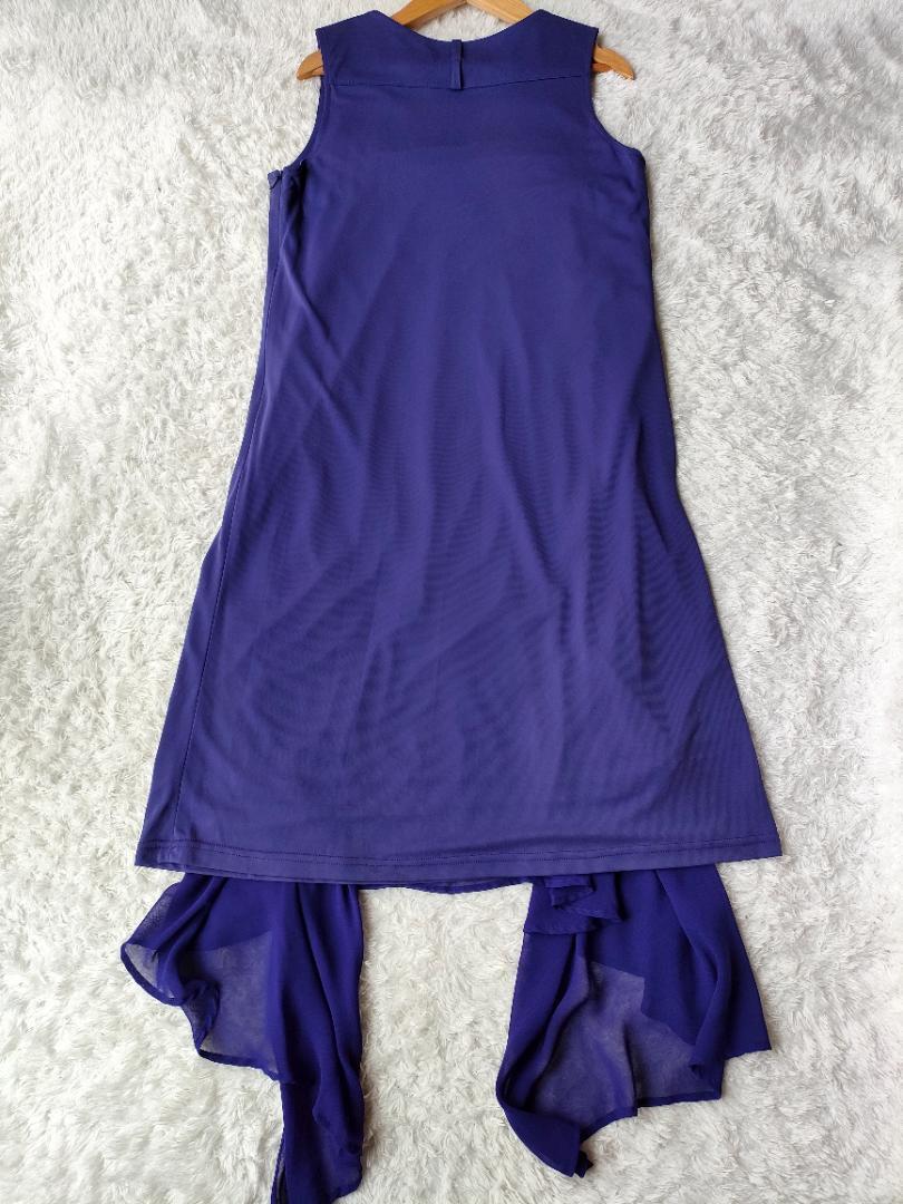 台形のシンプルな形のワンピースの前方に透け感あるシフォンが下がっているデザインです。