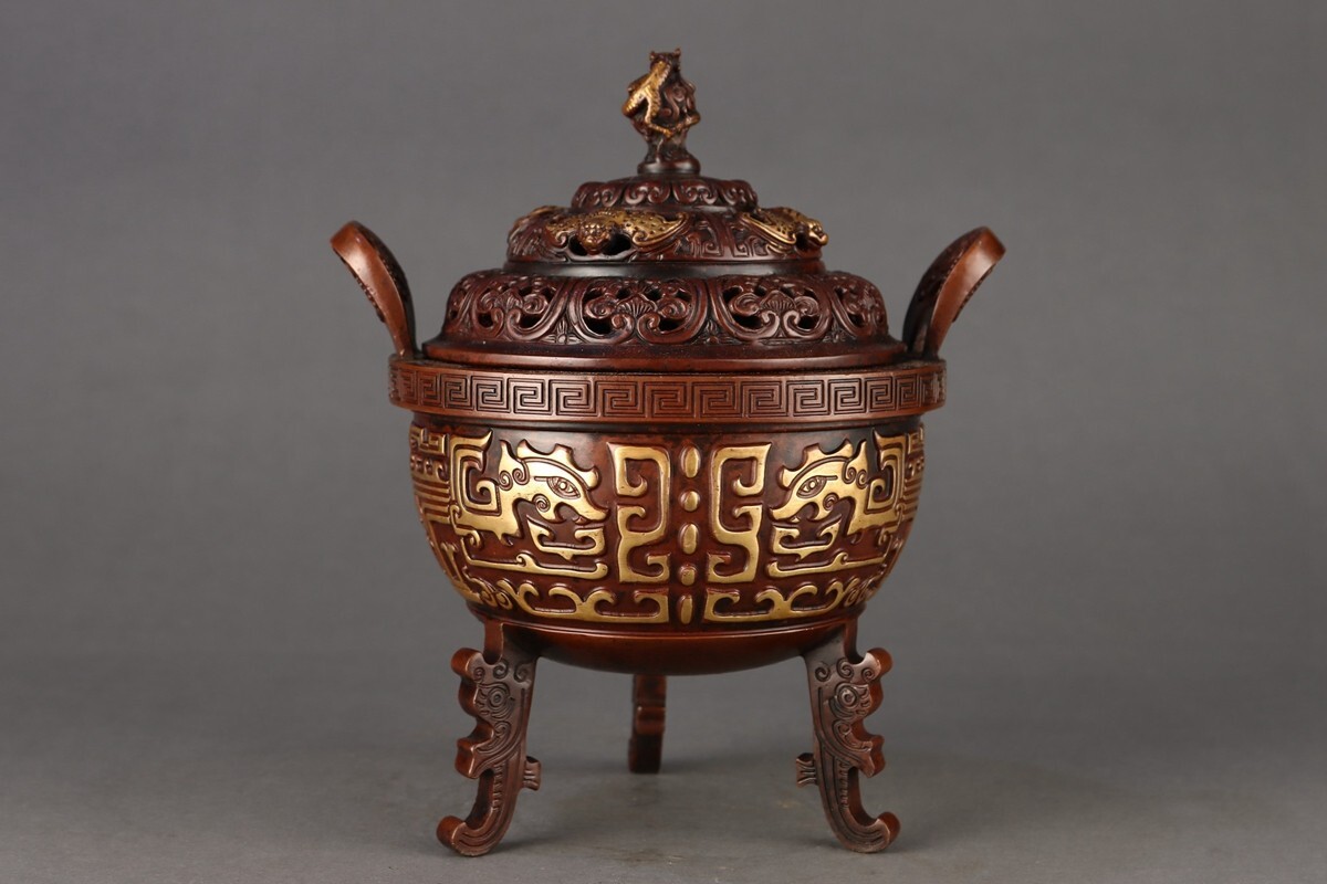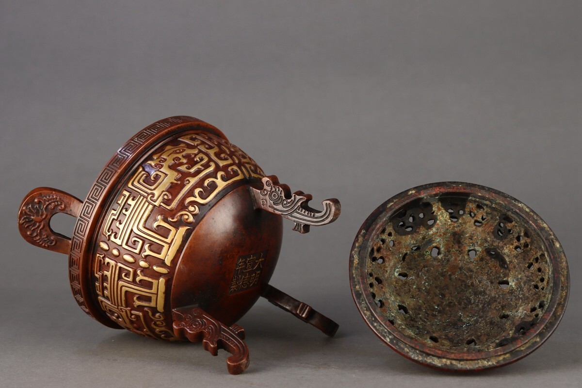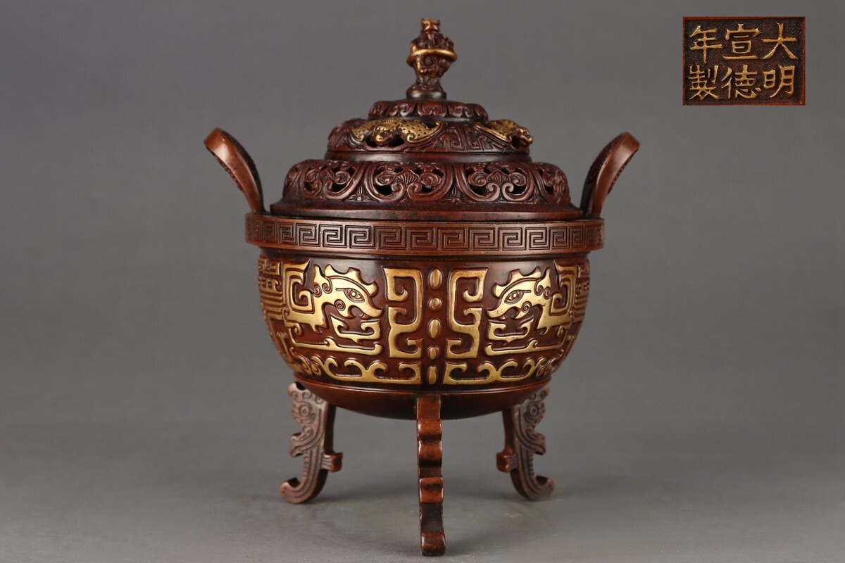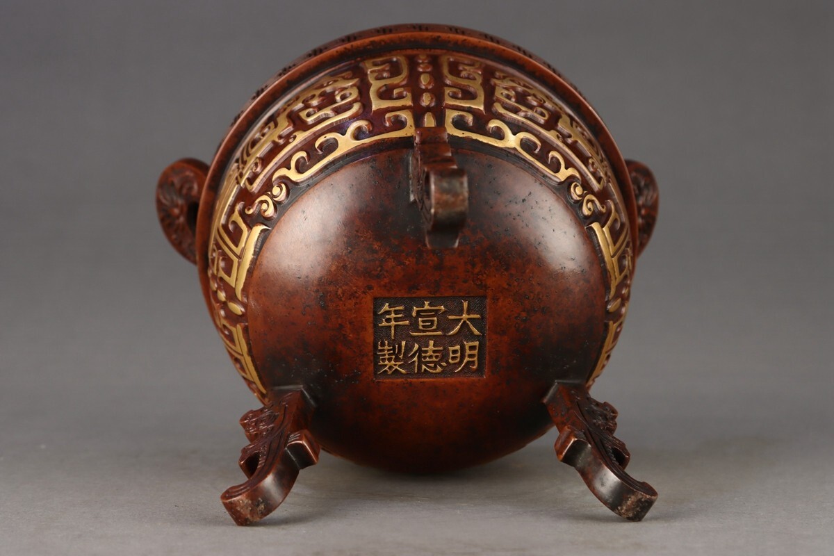 【瓏】古銅鏨刻彫 塗金饕餮紋 鼎式薰炉 大明宣徳年製 銅器 古美術 骨董品 香道具 蔵出