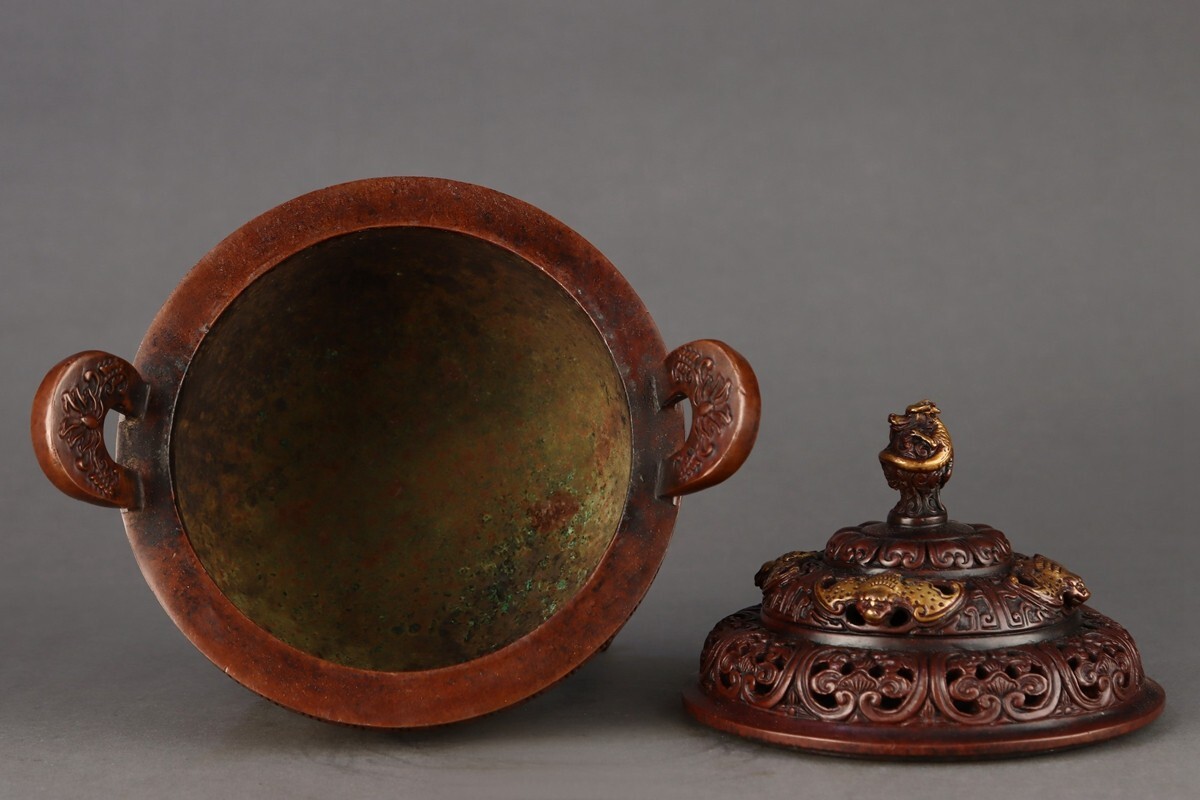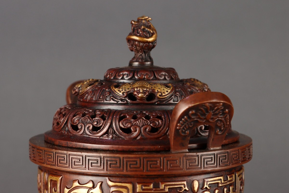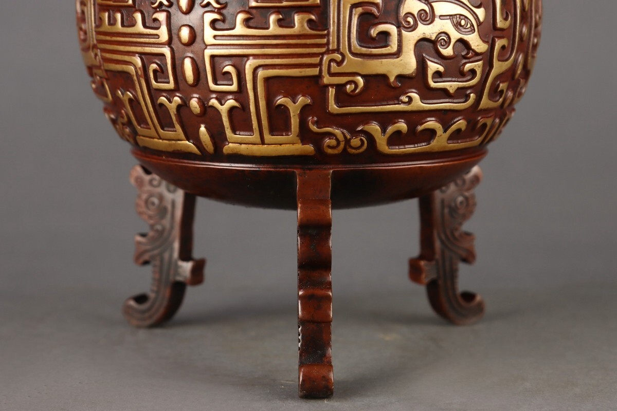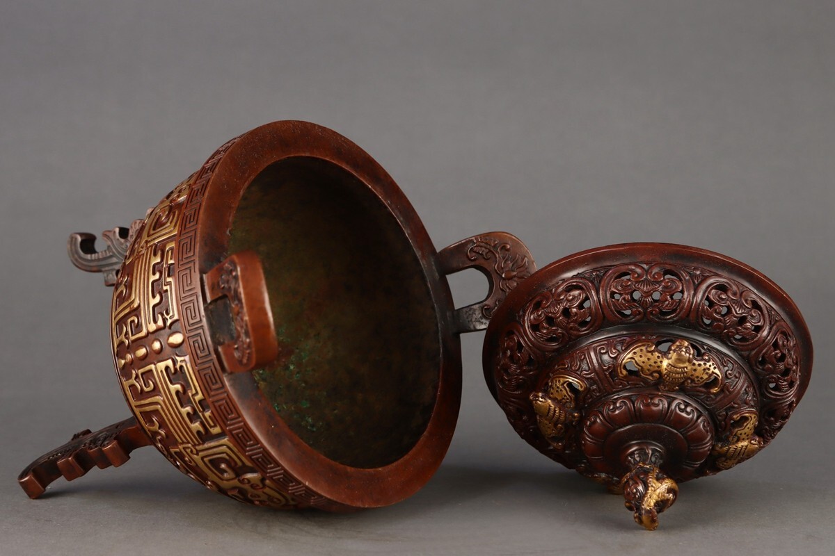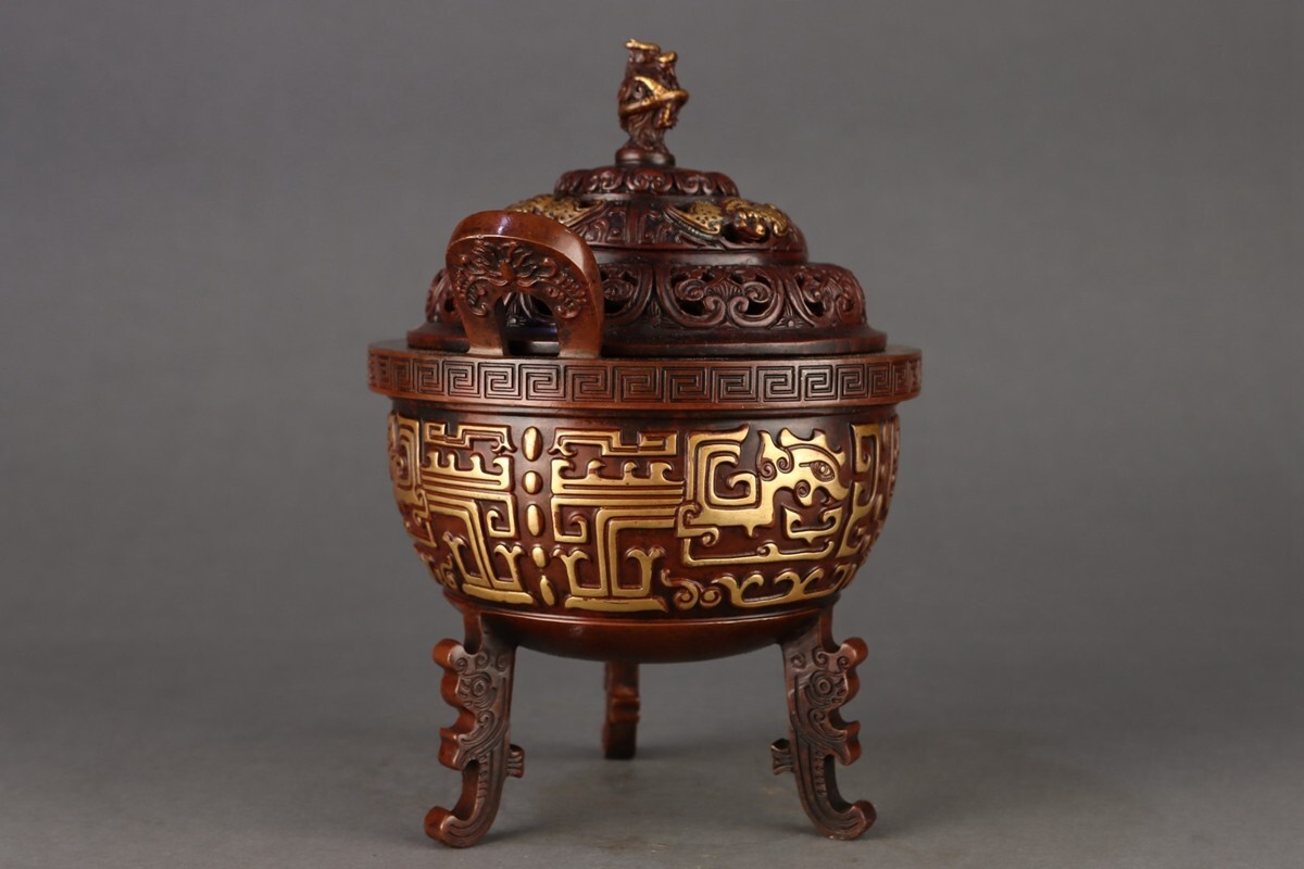 【瓏】古銅鏨刻彫 塗金饕餮紋 鼎式薰炉 大明宣徳年製 銅器 古美術 骨董品 香道具 蔵出