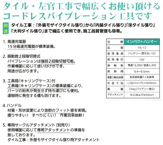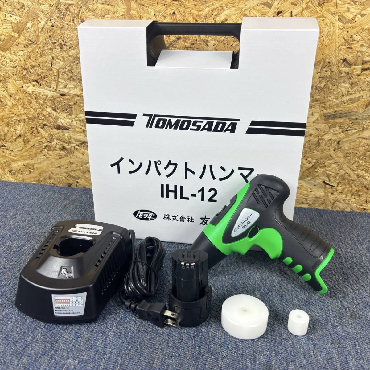 【新品未使用品】TOMOSADA 友定建機 12V 充電式インパクトハンマー IHL-12 バッテリー1個(1.5Ah)充電器+パーツ+ケース タイルパッチ 2936