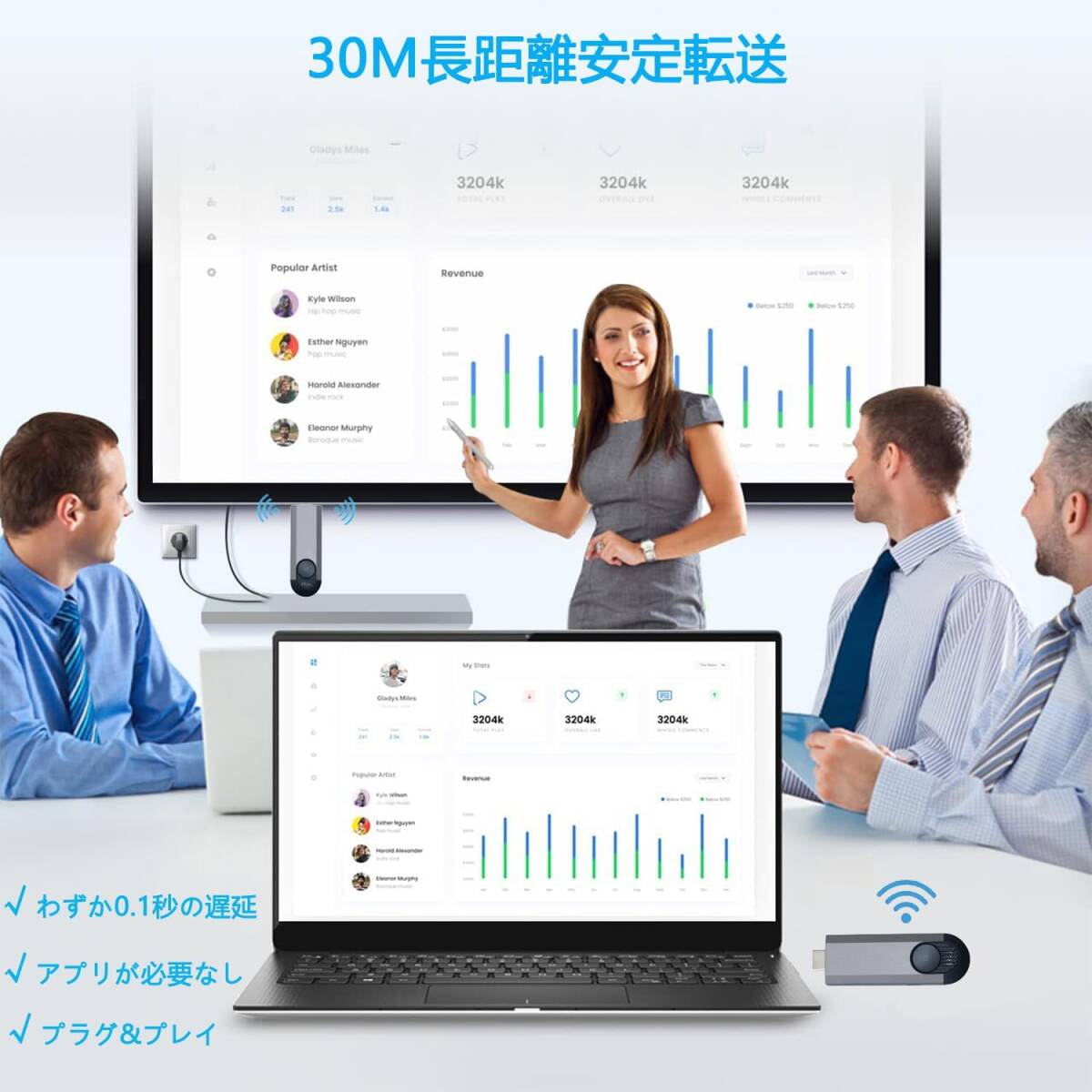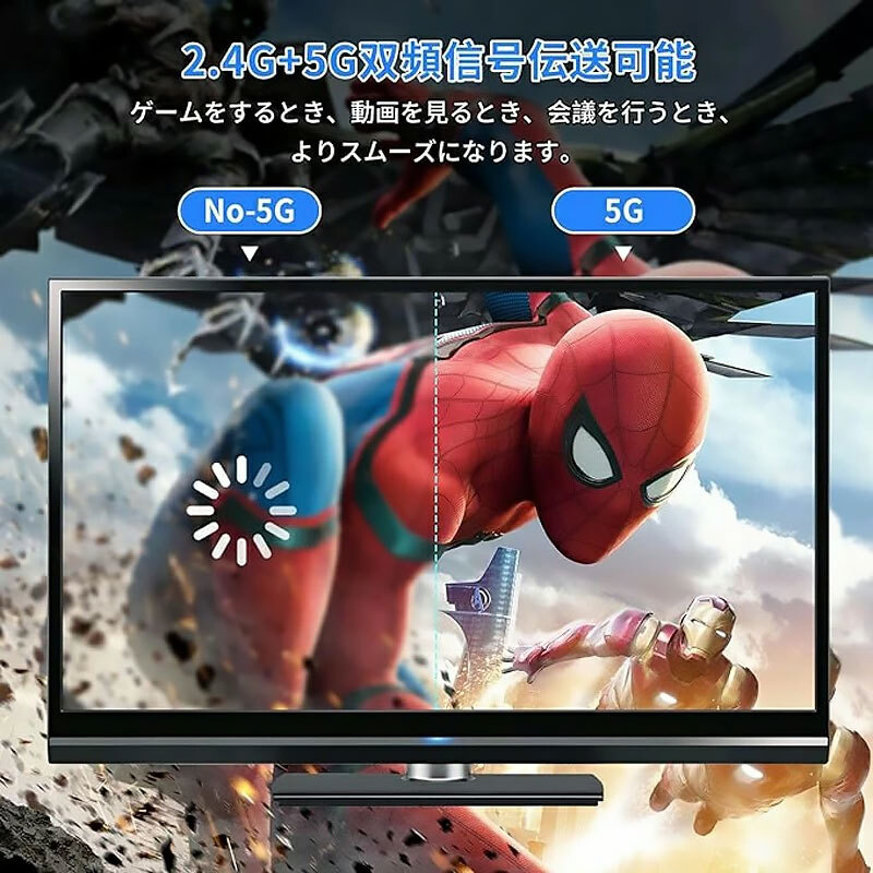 ワイヤレスHDMIは1080PのフルHD解像度、5.8Gの無線デュアルバンド信号を持ち、電波干渉対策、高品質のHDMI映像信号、高品質の音声信号、最大30Mの信号伝送を実現。信号の応答速度が速くて安定していて遅延も画面ちらつきもありません。