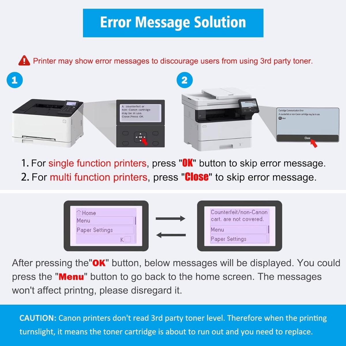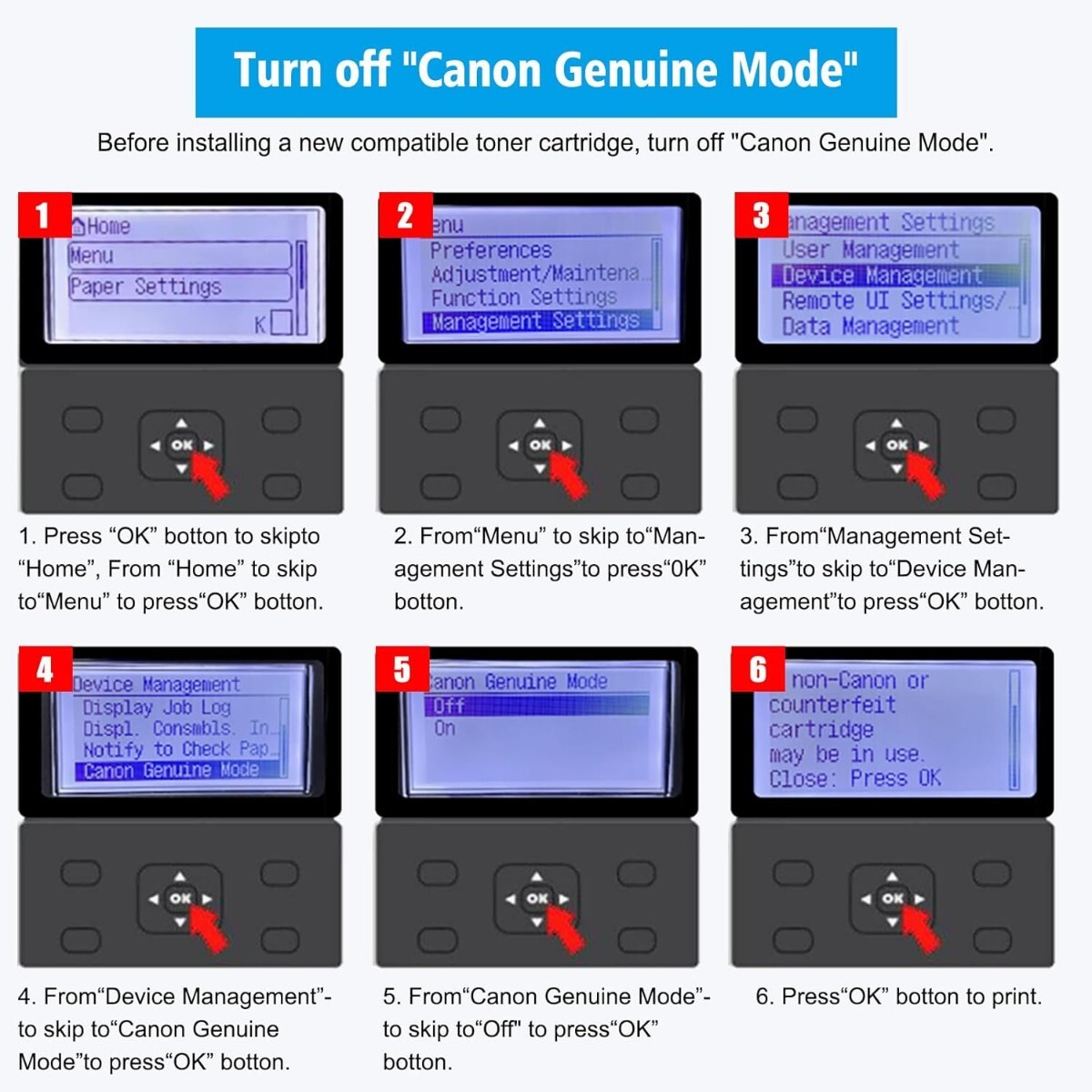 1.注意: プリンターに「Canon 純正モード」がある場合は、このモードを閉じる必要があります。次の手順に従って Canon 純正モードを閉じてください: メニュー > 管理設定 > デバイス管理 > Canon 純正モード > オフ。Canon 純正モードを閉じた後、 互換性のあるトナーをインストールすると、プリンターに「Canon 以外のカートリッジが挿入されている可能性があります」というメッセージが表示されます。「OK」キーを押すだけで、トナーが機能するはずです。